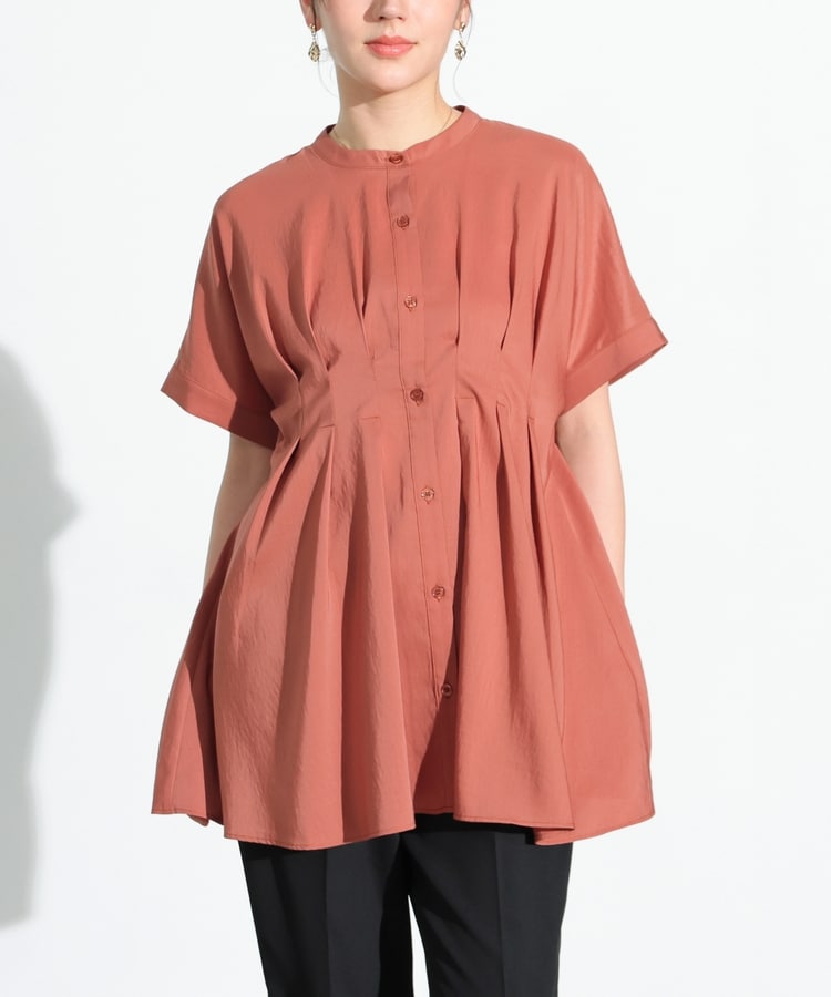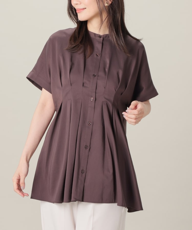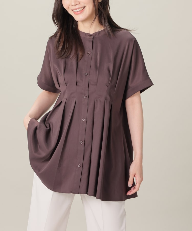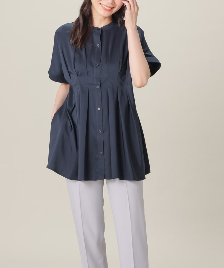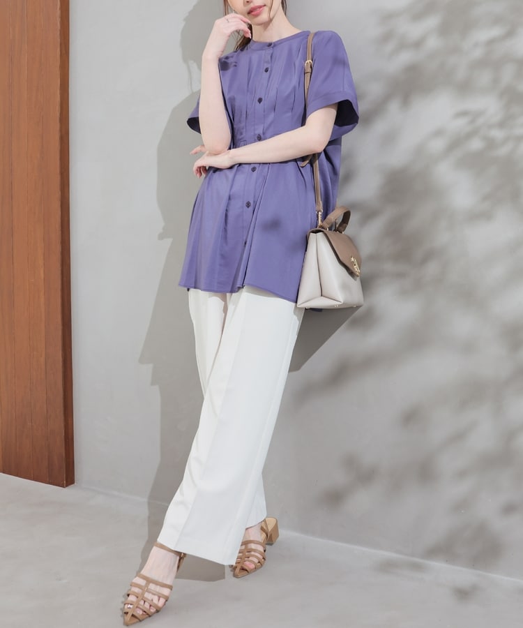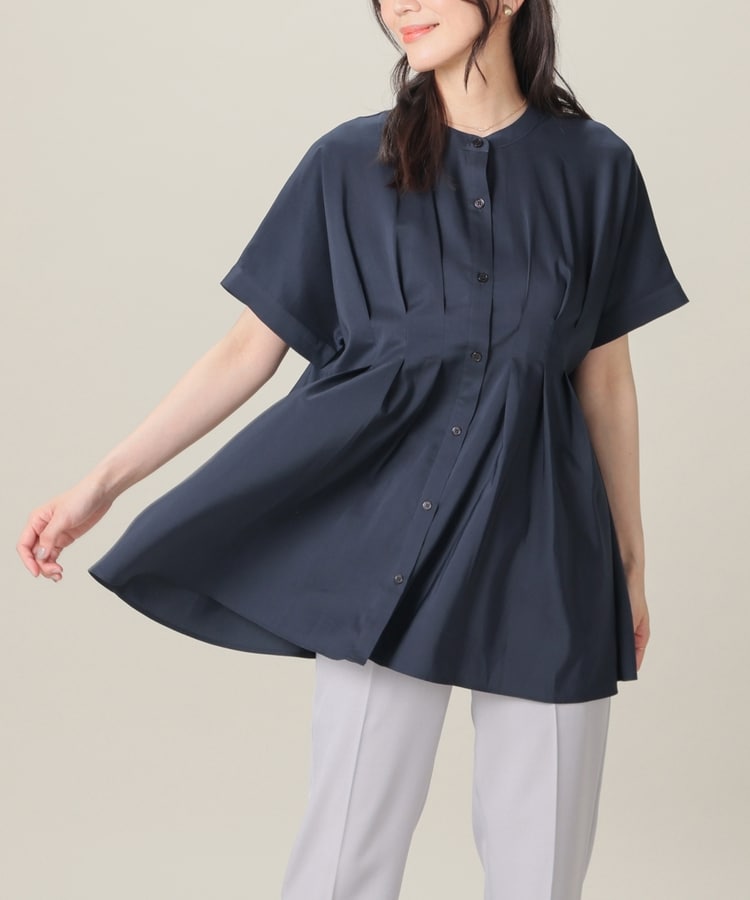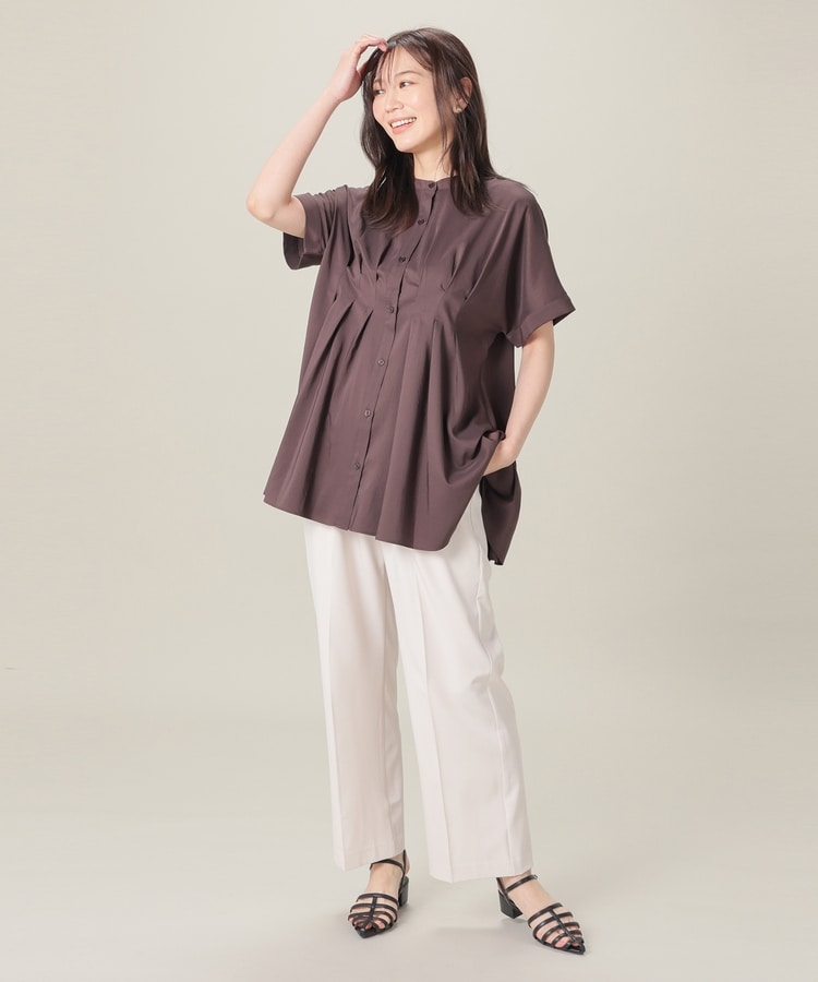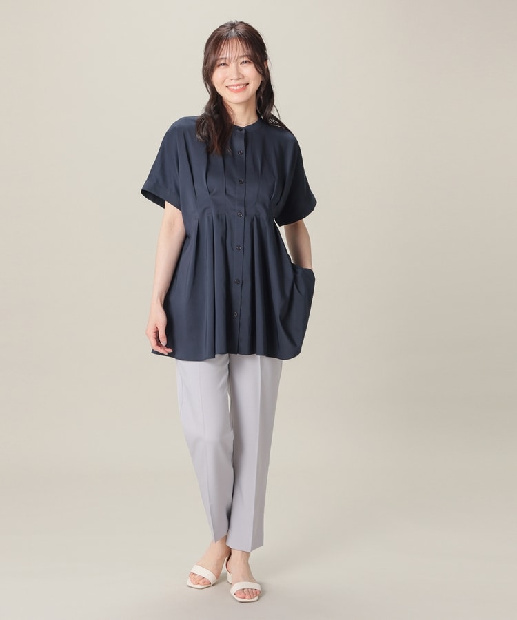 高めの位置に入れたタックでウエストをシェイプさせた、スタイルアップ効果抜群のメリハリシルエット。