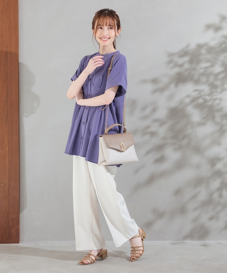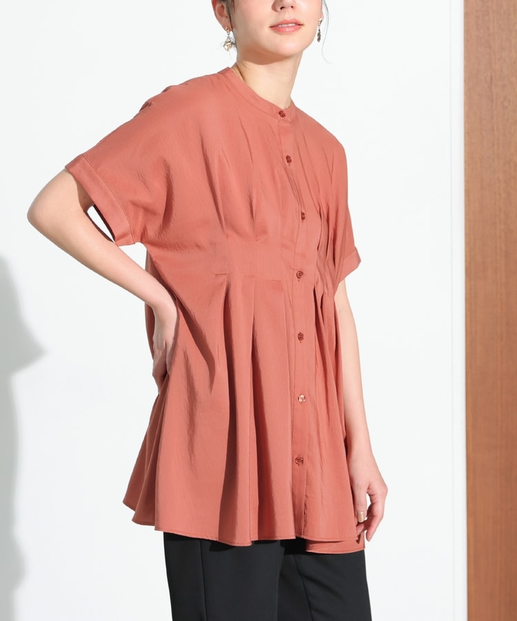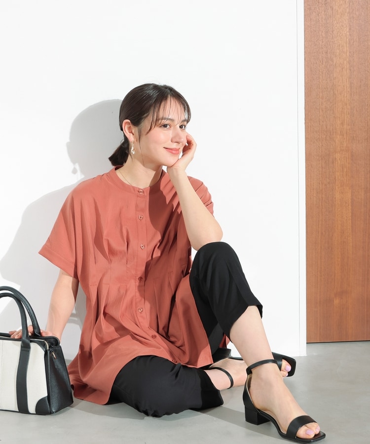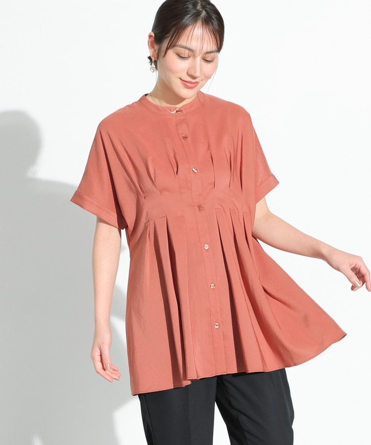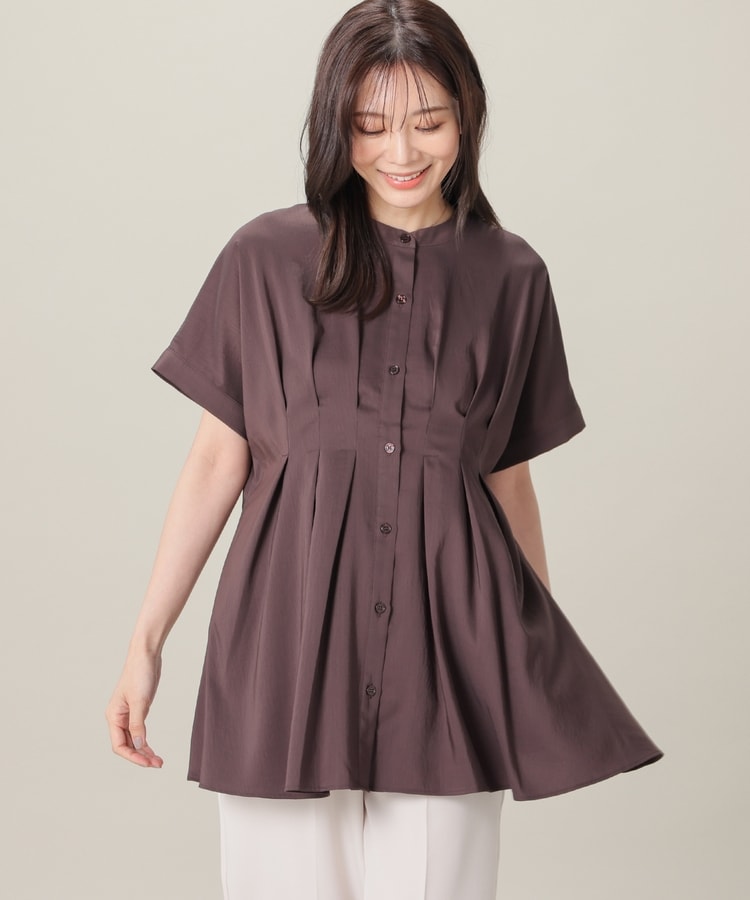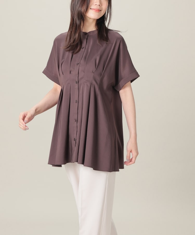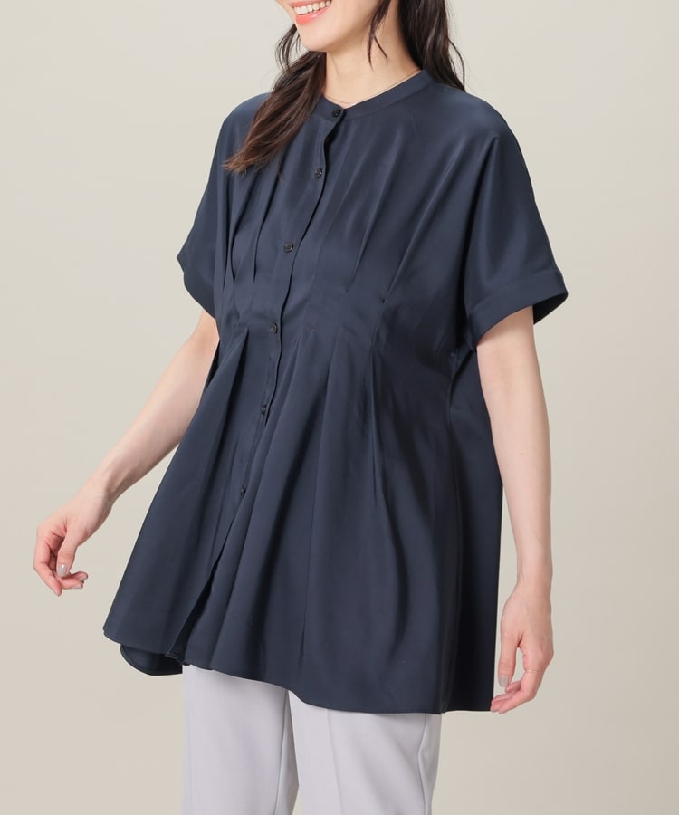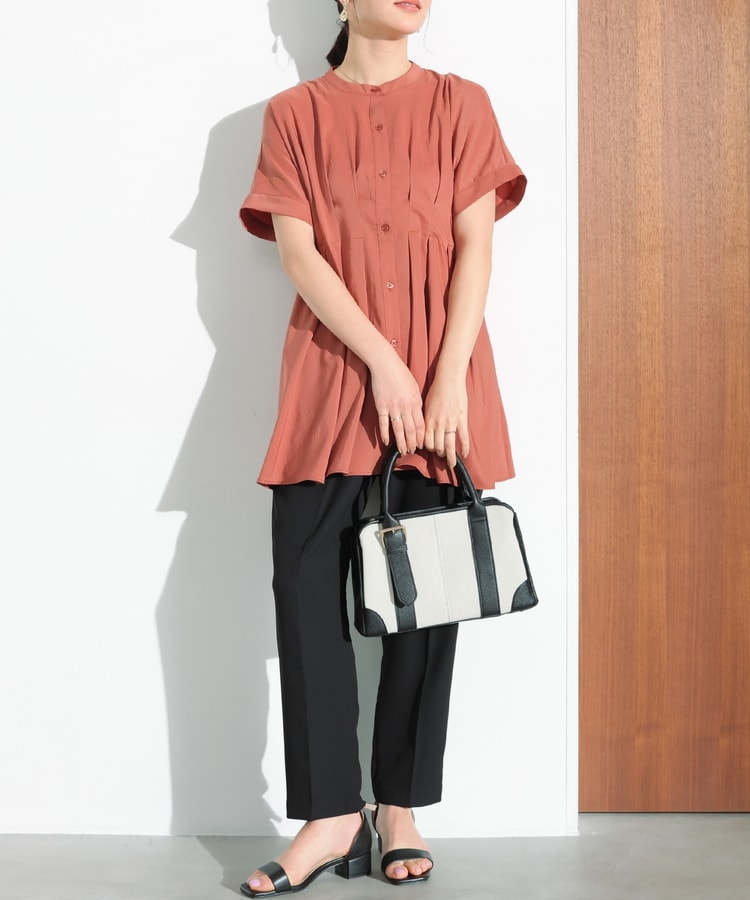 高めの位置に入れたタックでウエストをシェイプさせた、スタイルアップ効果抜群のメリハリシルエット。