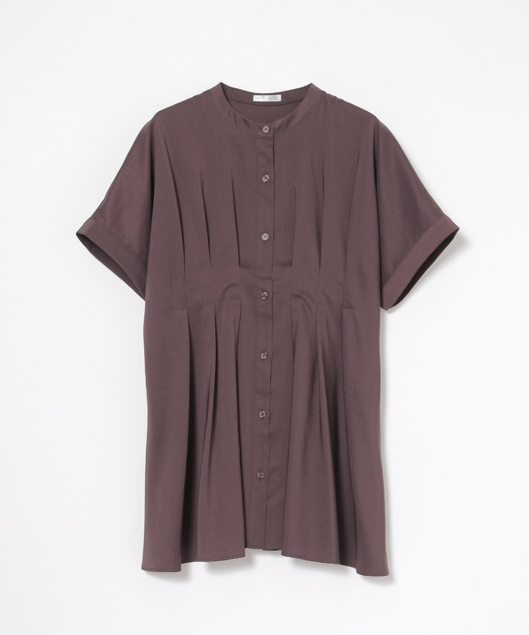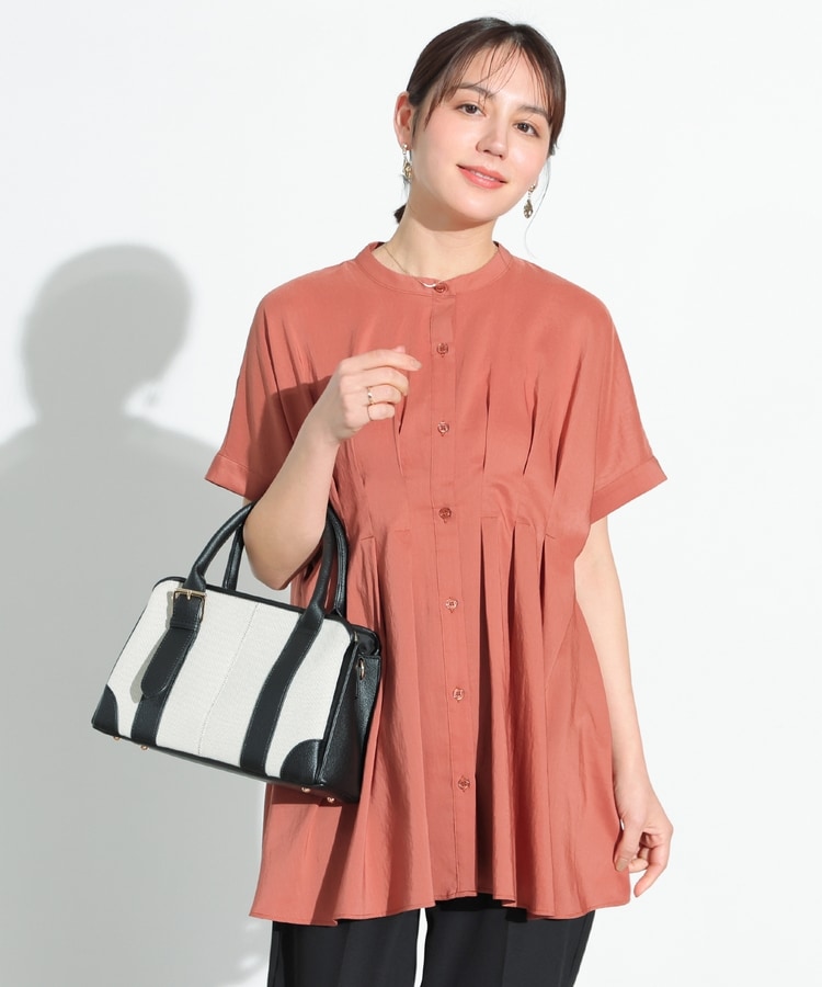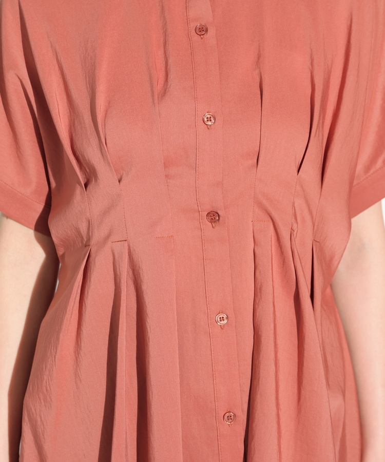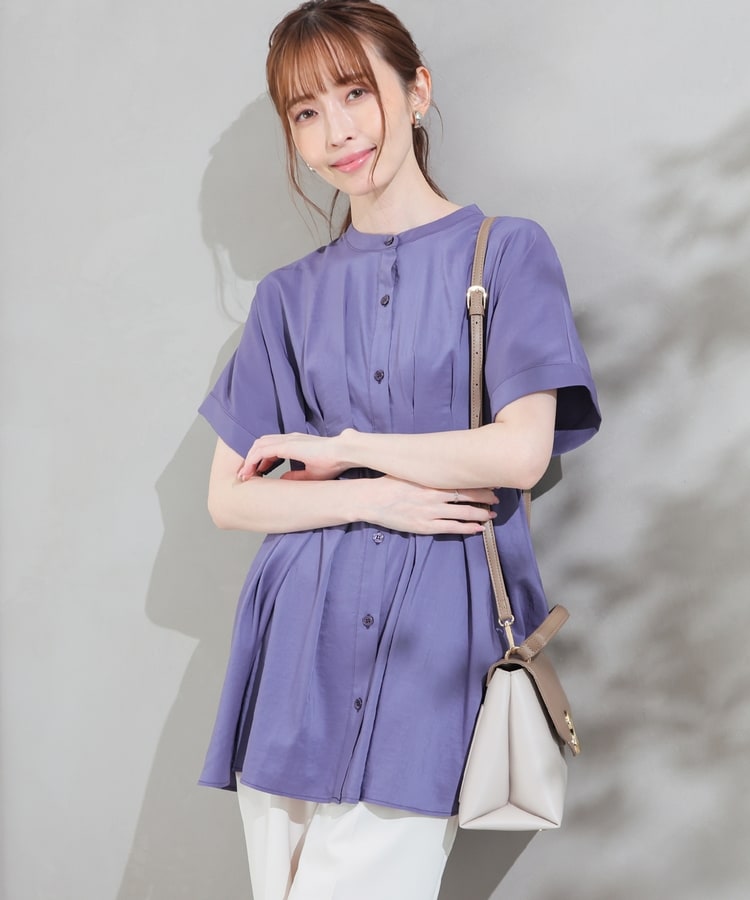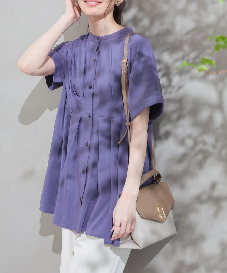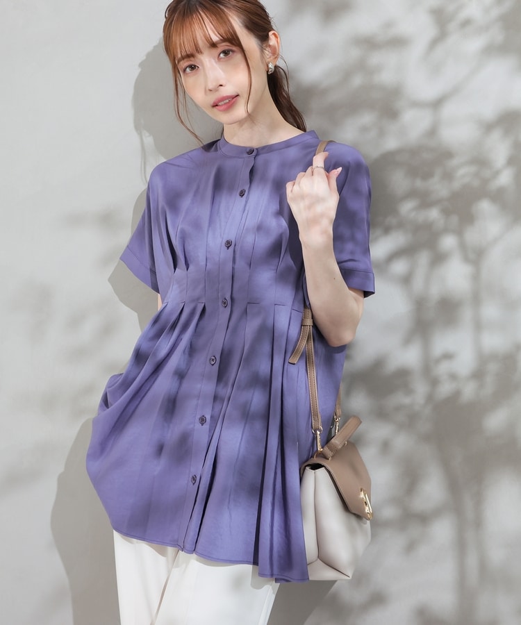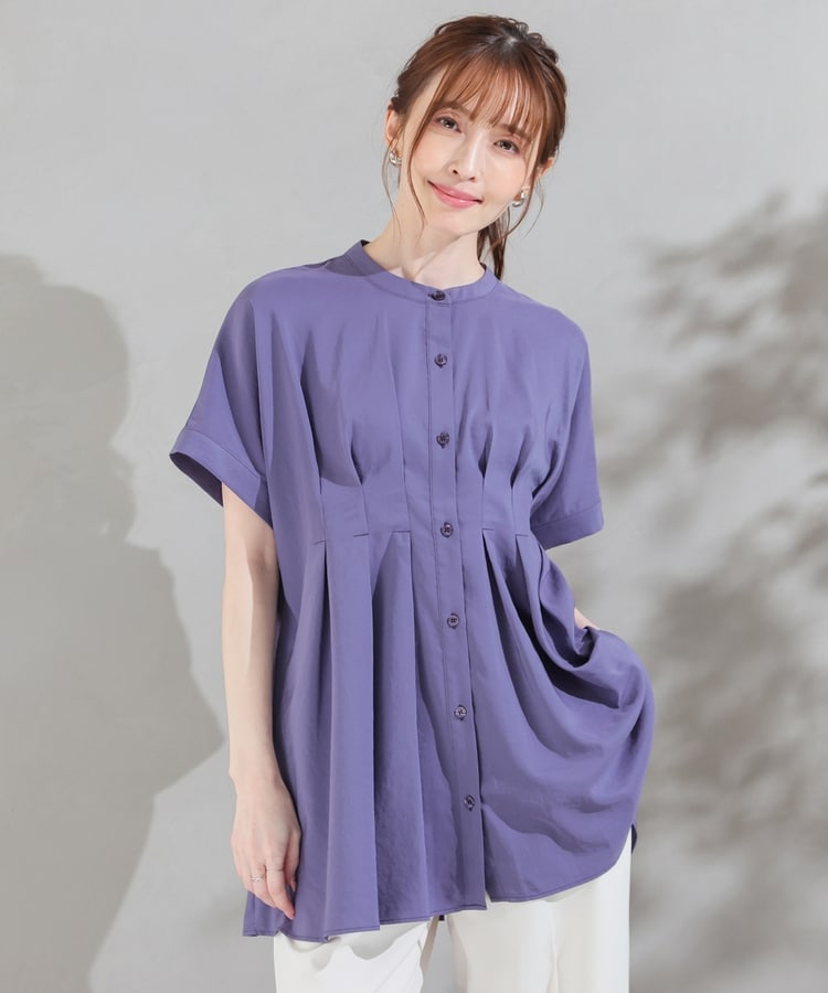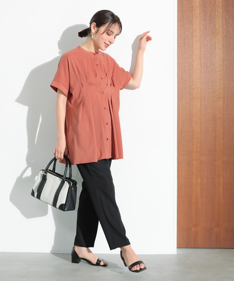 高めの位置に入れたタックでウエストをシェイプさせた、スタイルアップ効果抜群のメリハリシルエット。