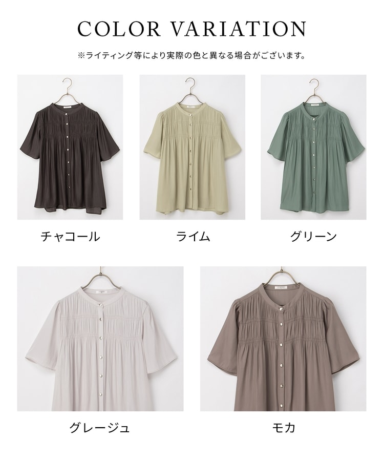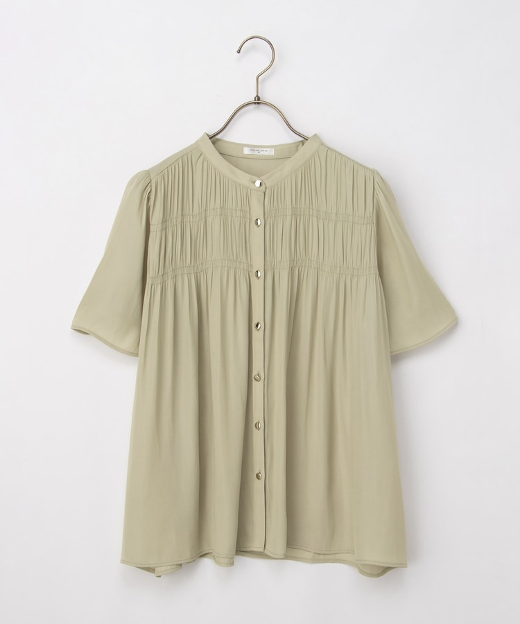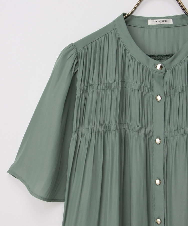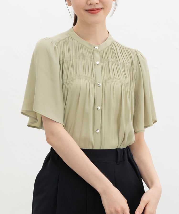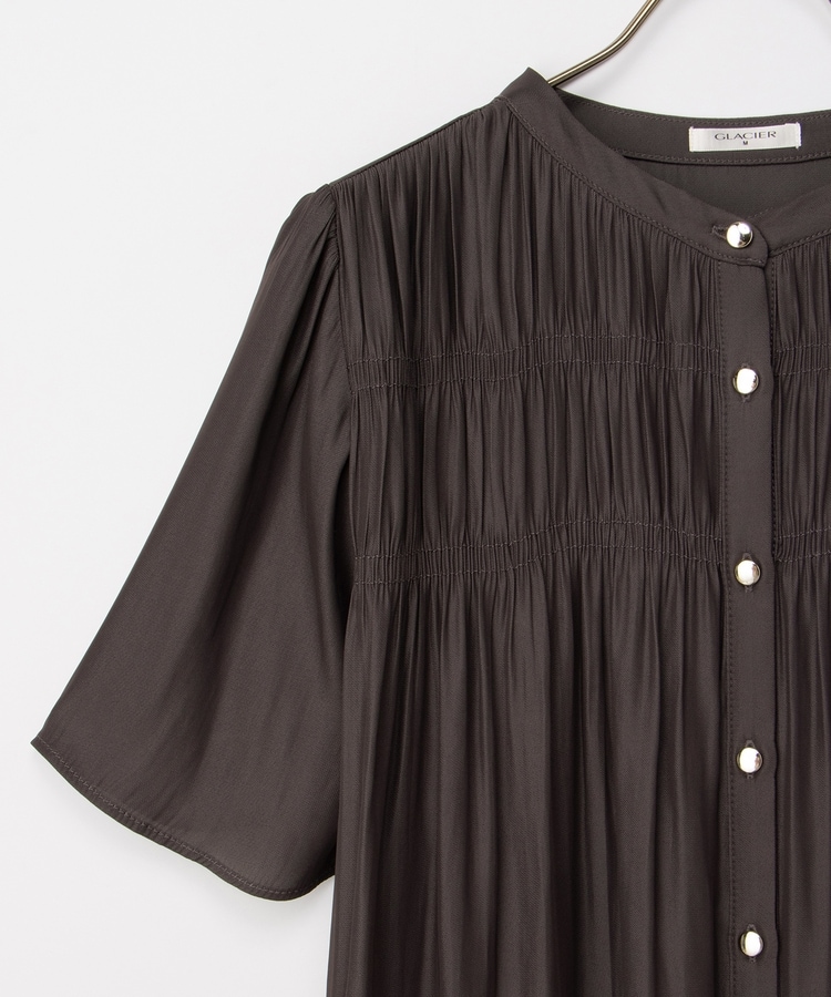 胸元シャーリングとゴールドボタンで、1枚でスタイリングがぐっと華やかに着映えるデザイン。