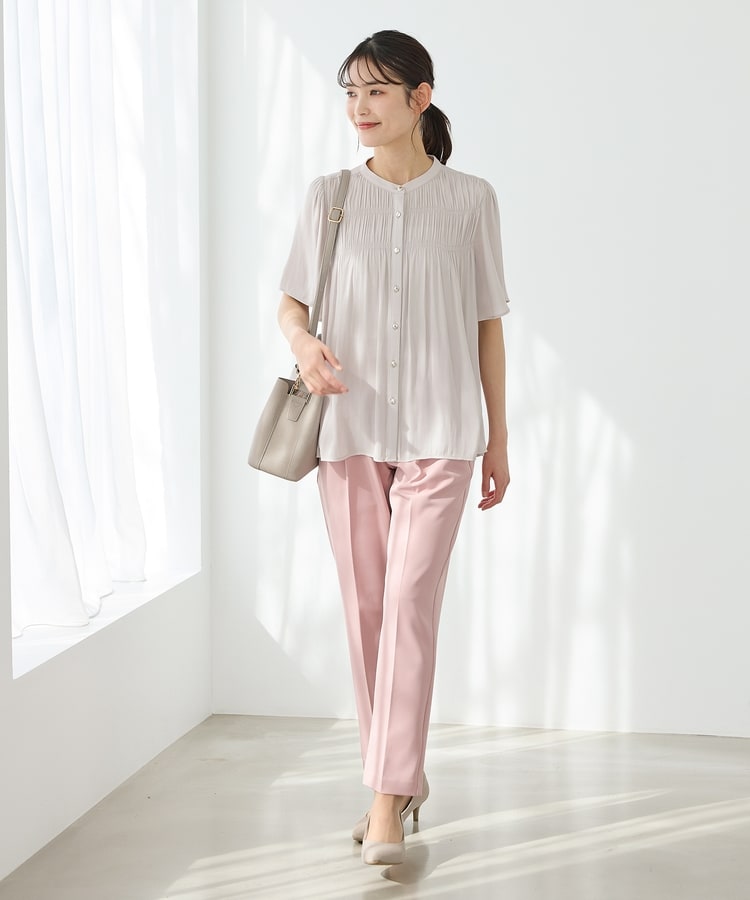 顔周りをすっきり見せるバンドカラ―。