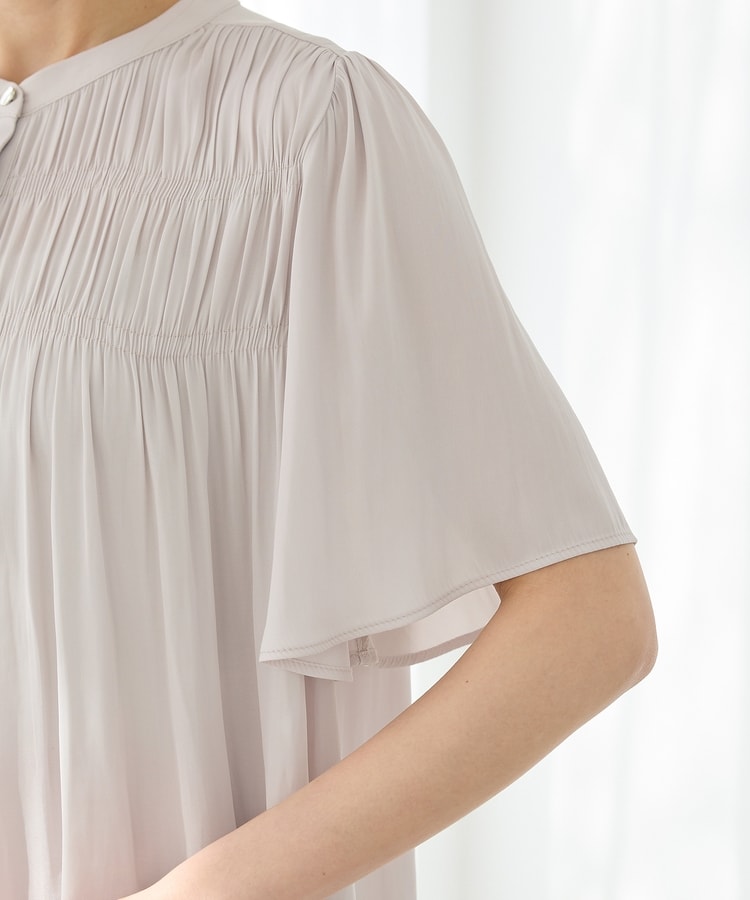 肩とバックは細かなギャザー入りで、柔らかなドレープのふわっと広がる美しいシルエットと長めのフレア袖で体型も二の腕もカバー。