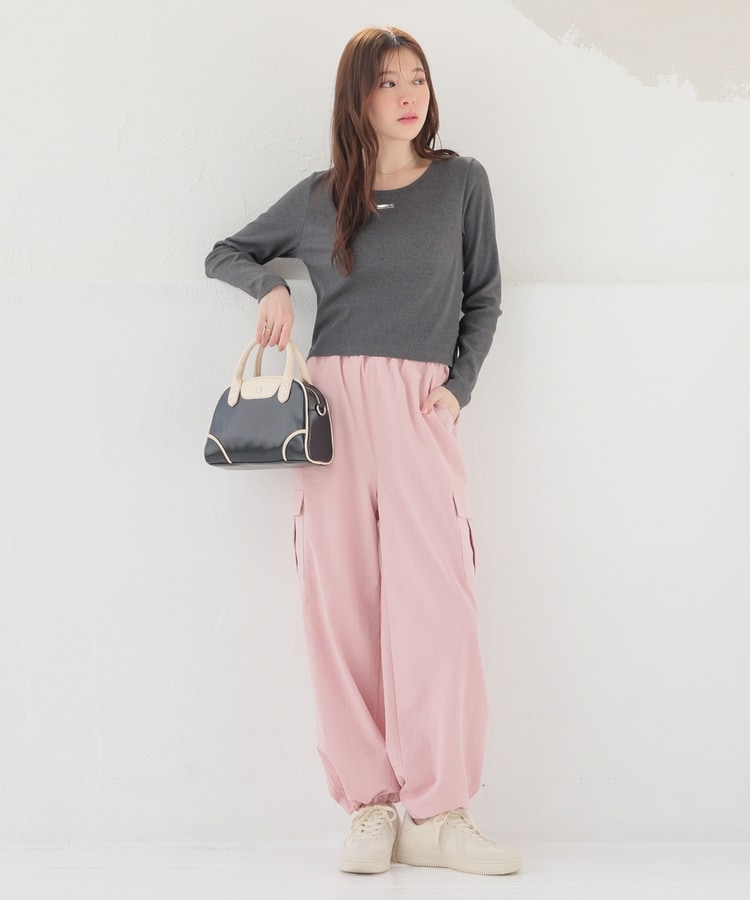 ハイウエスト&裾絞りのメリハリシルエットながら、ゆったり幅とウエストゴムでリラクシーなはき心地。