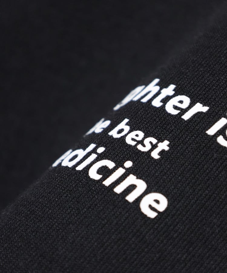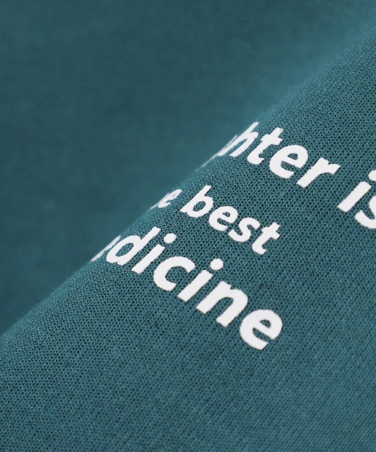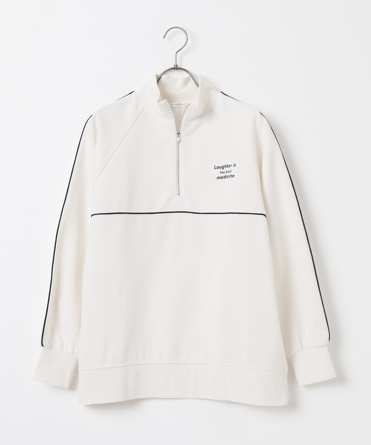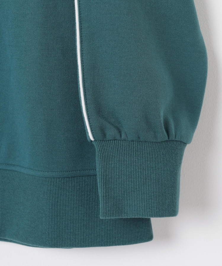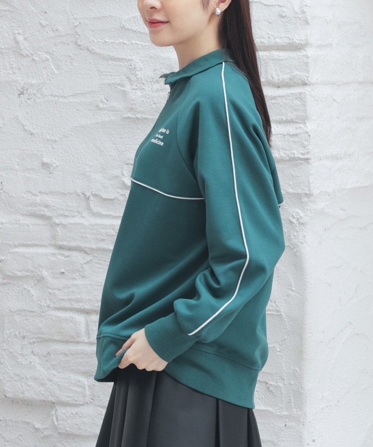 配色パイピングと、胸元のワンポイントロゴがコーデのアクセントに。