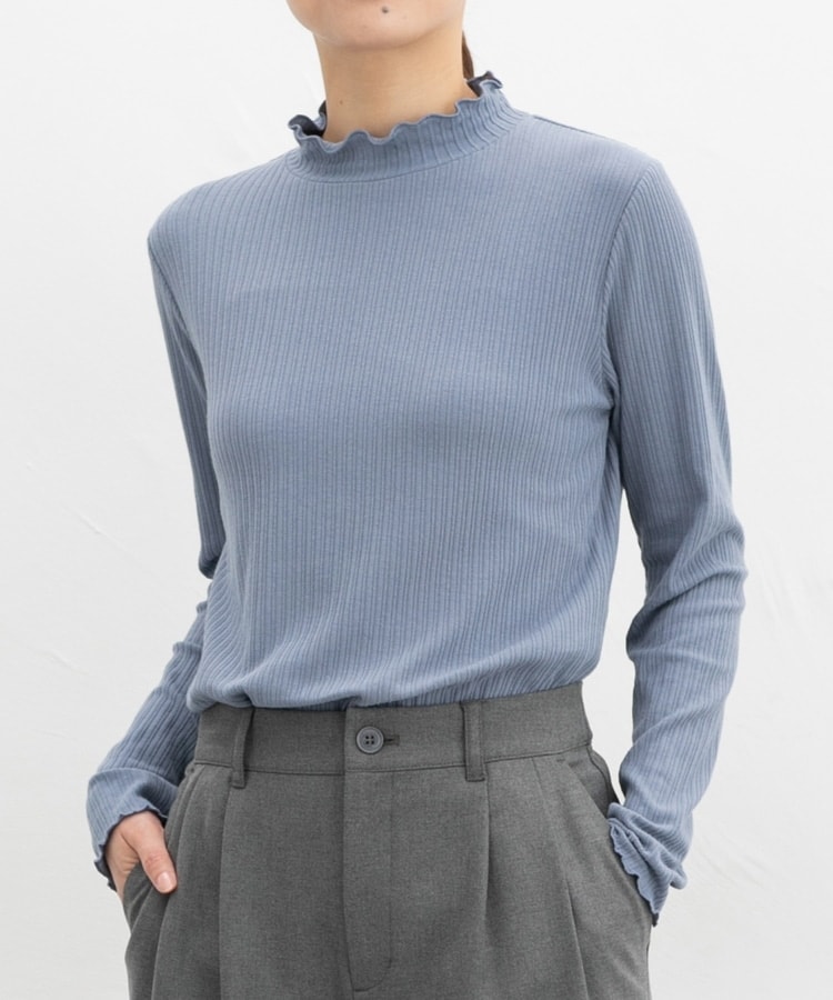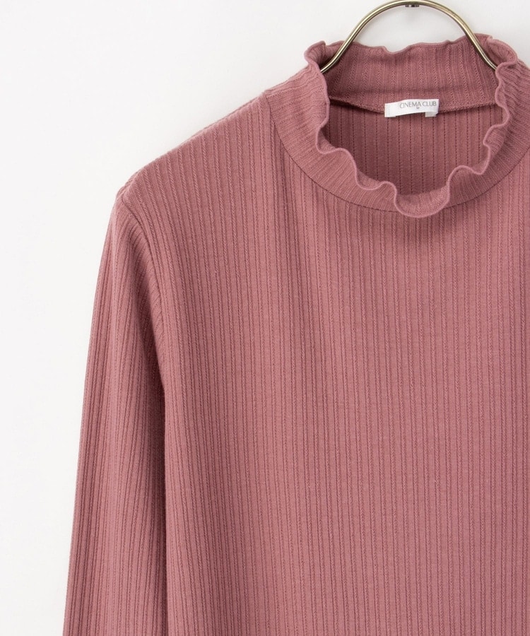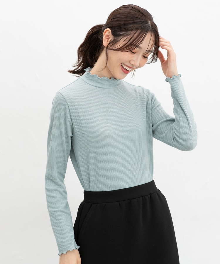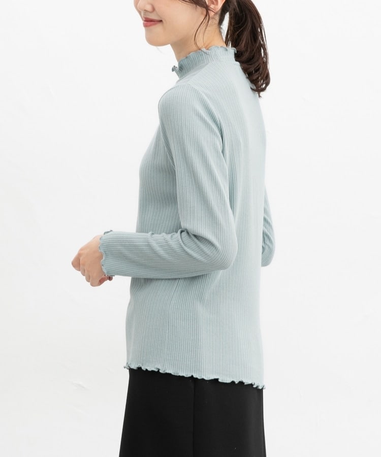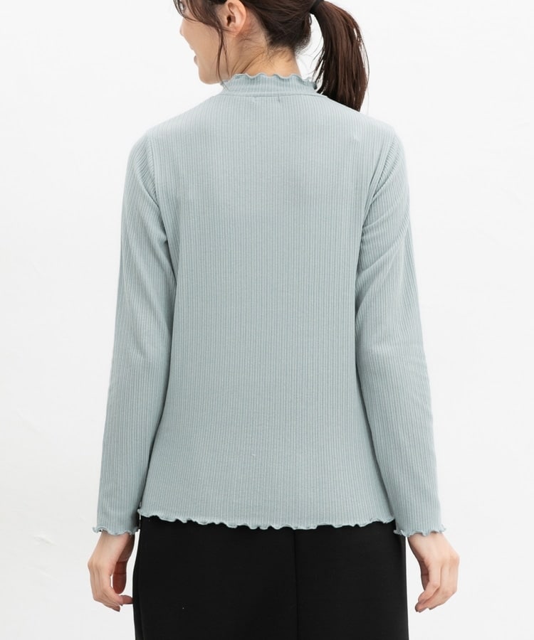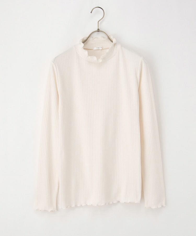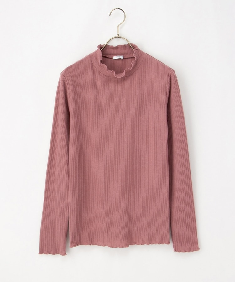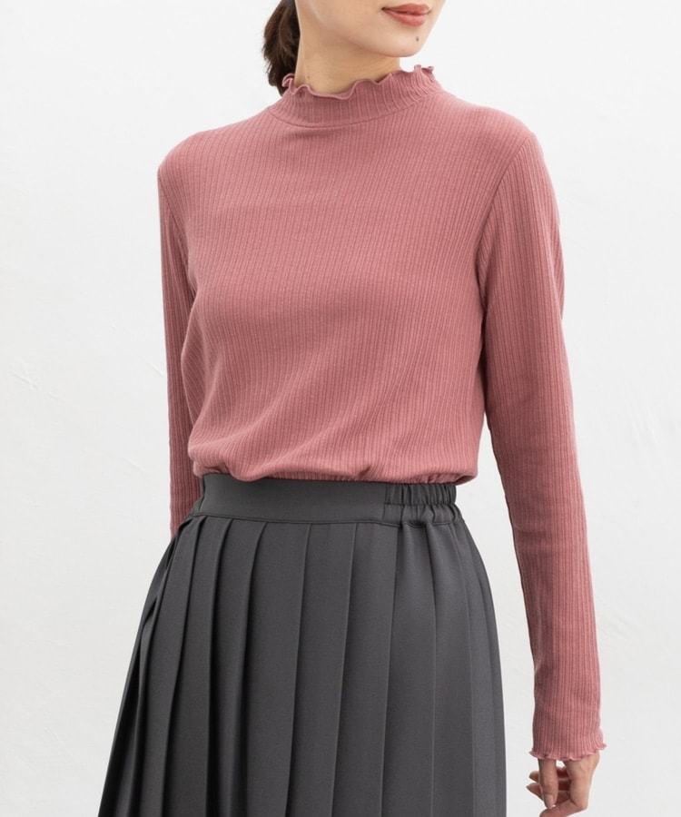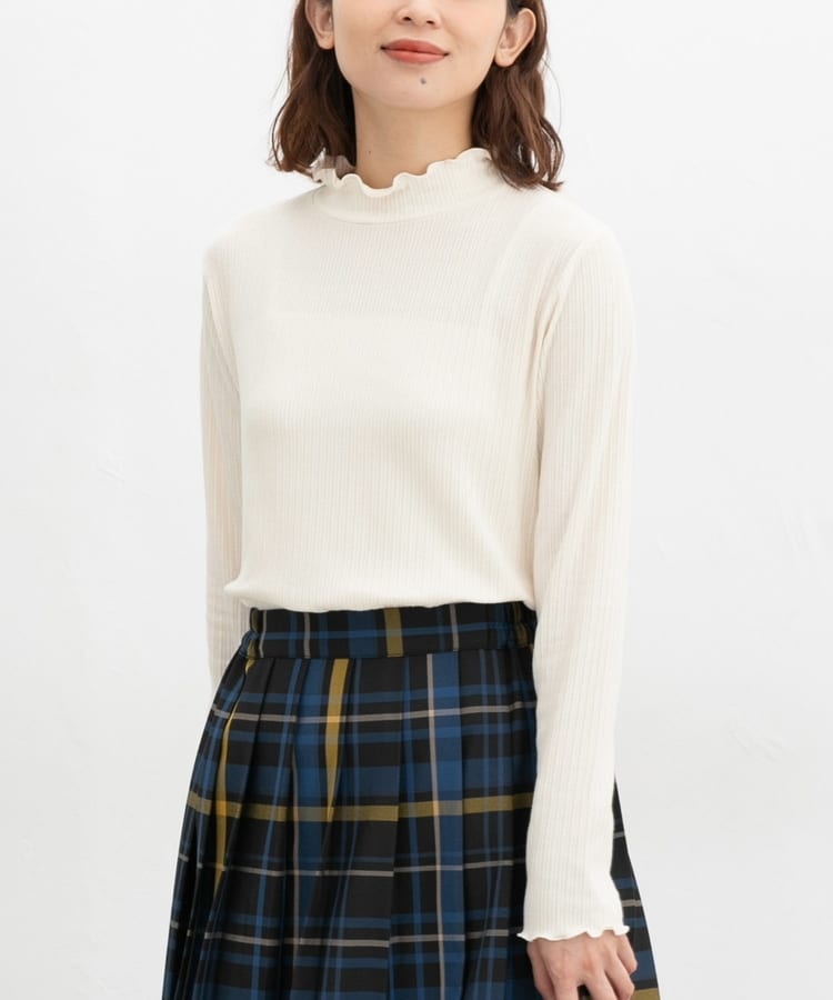 首元を隠してあったかな、程よい高さのプチハイネックに、メロー使いで洒落感もプラスしたフェミニンなデザイン。