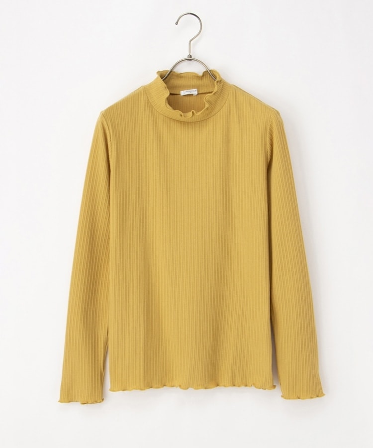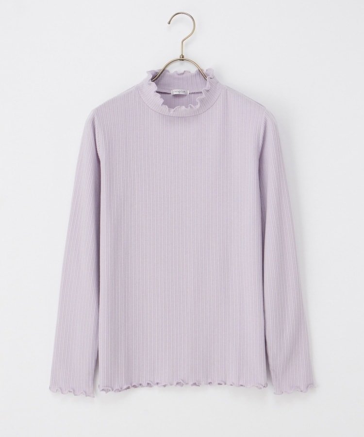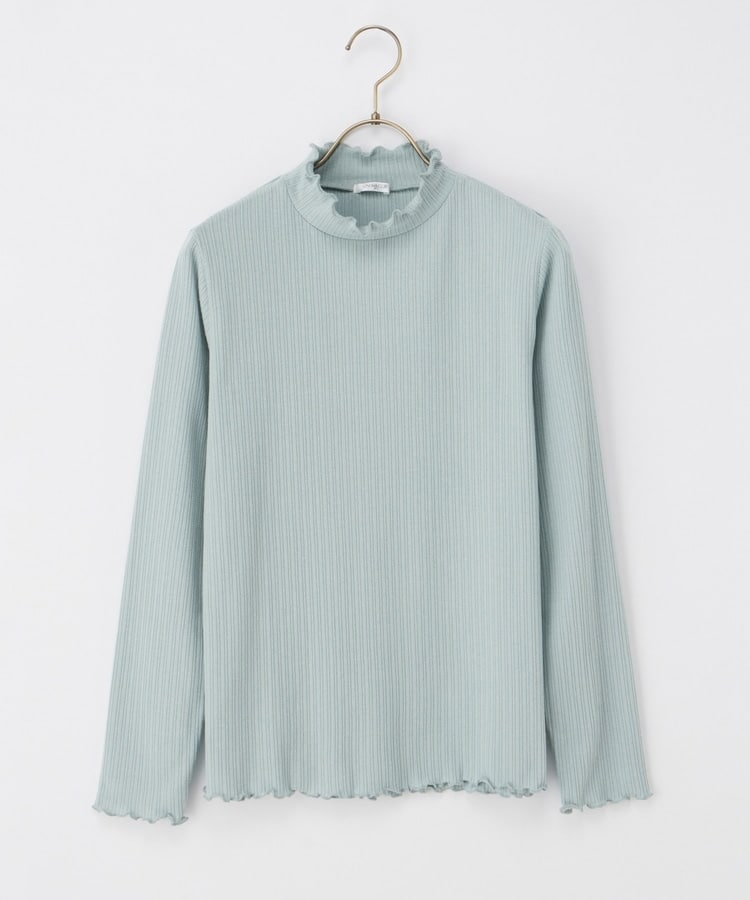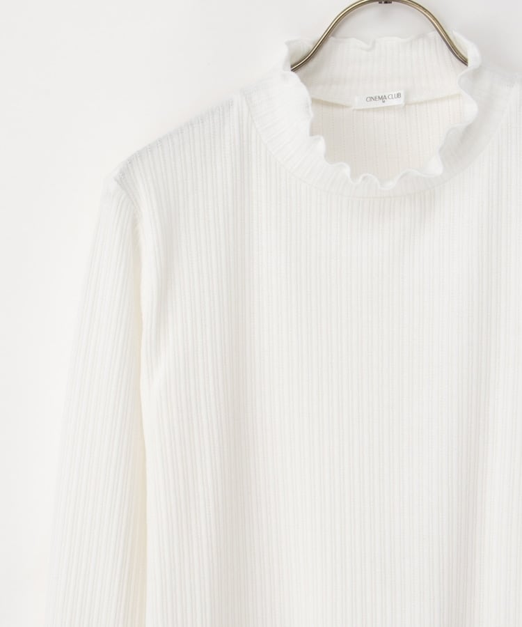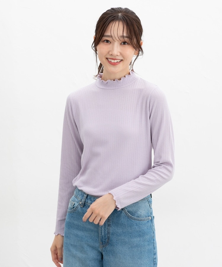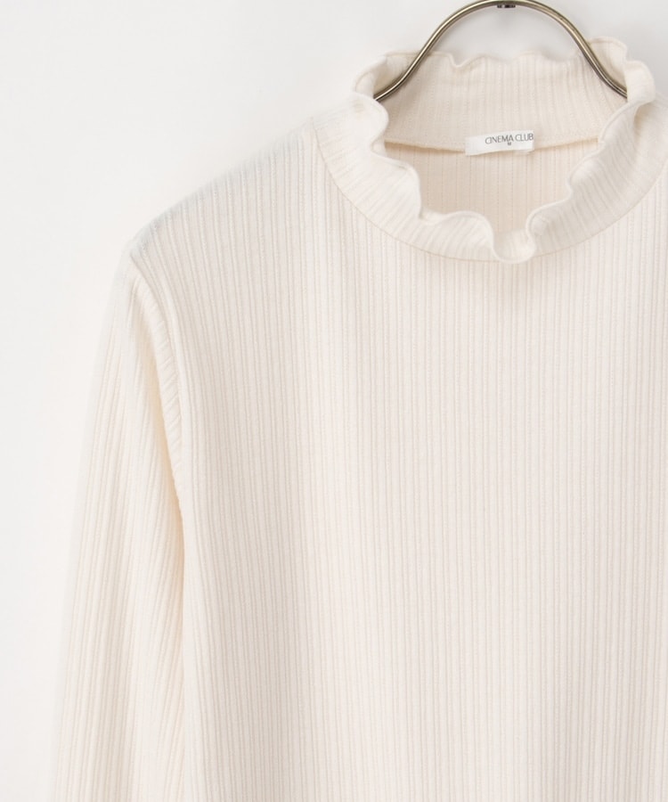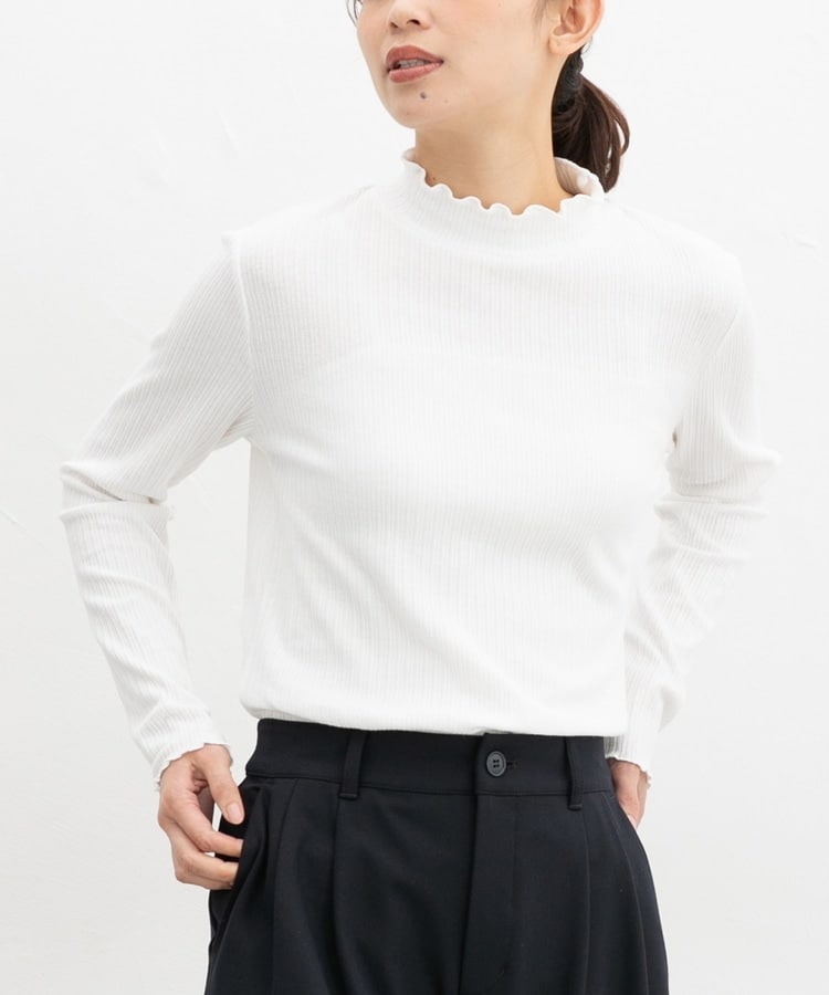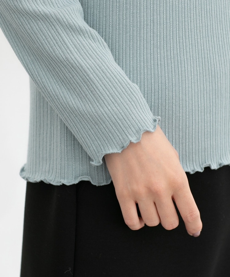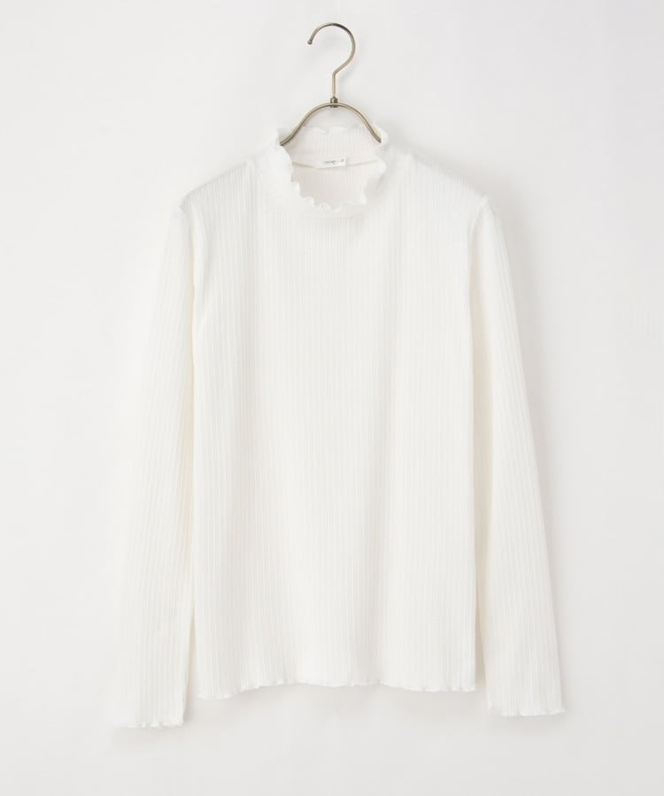 首元を隠してあったかな、程よい高さのプチハイネックに、メロー使いで洒落感もプラスしたフェミニンなデザイン。