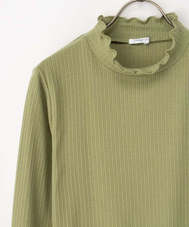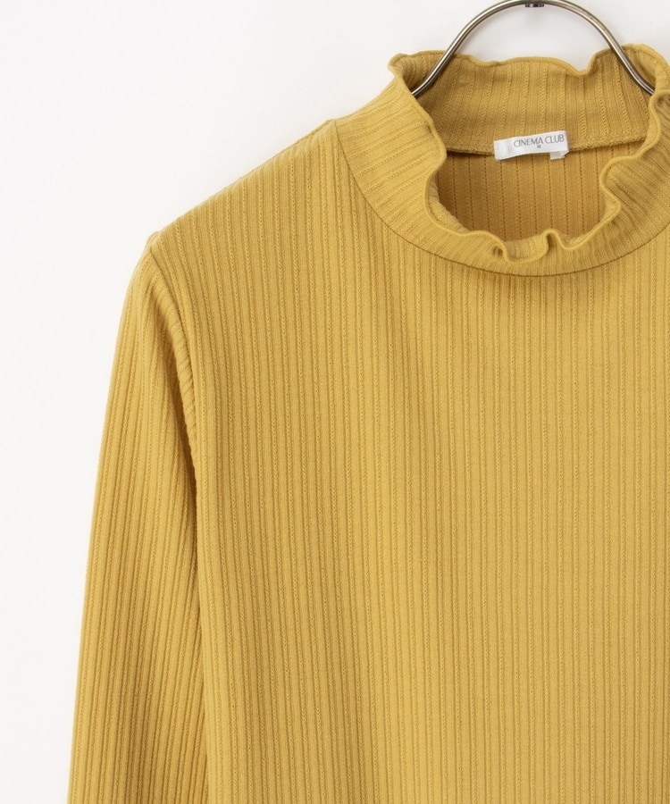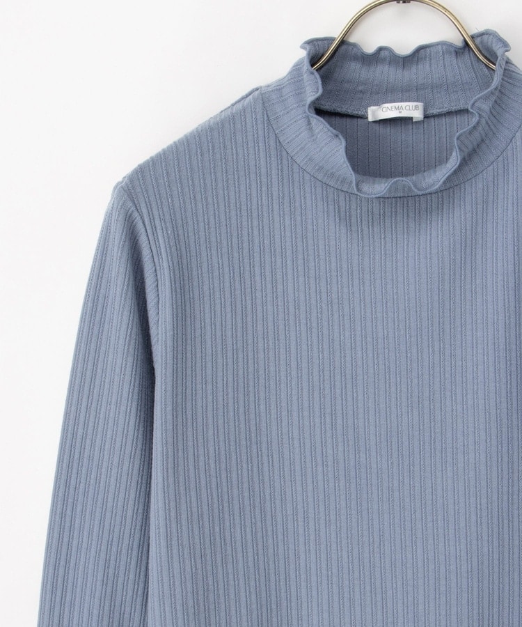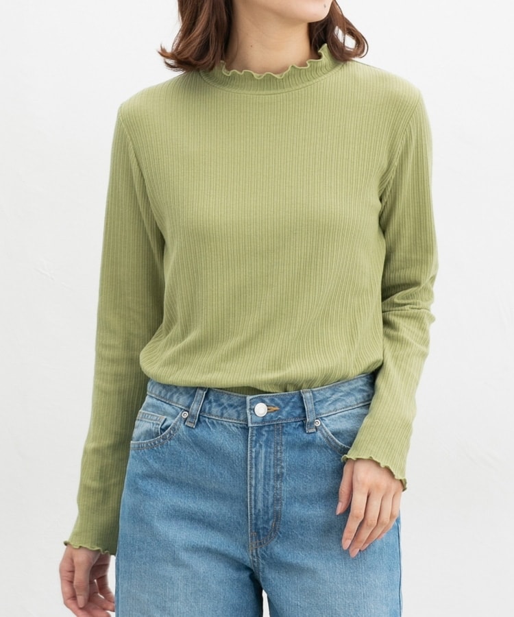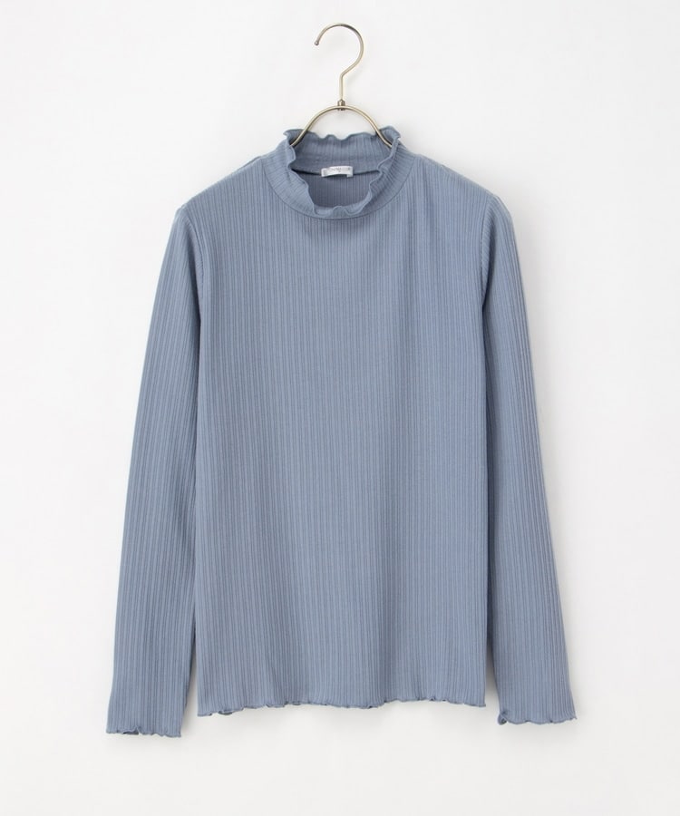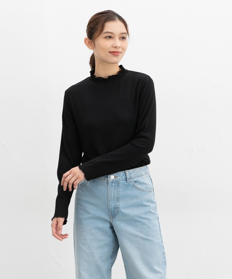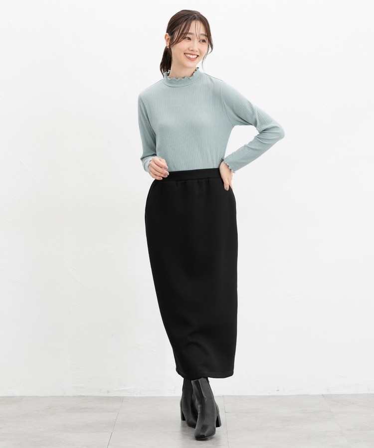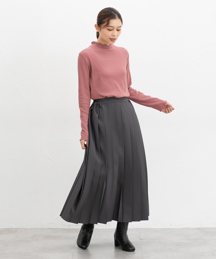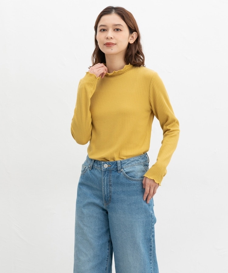 首元を隠してあったかな、程よい高さのプチハイネックに、メロー使いで洒落感もプラスしたフェミニンなデザイン。