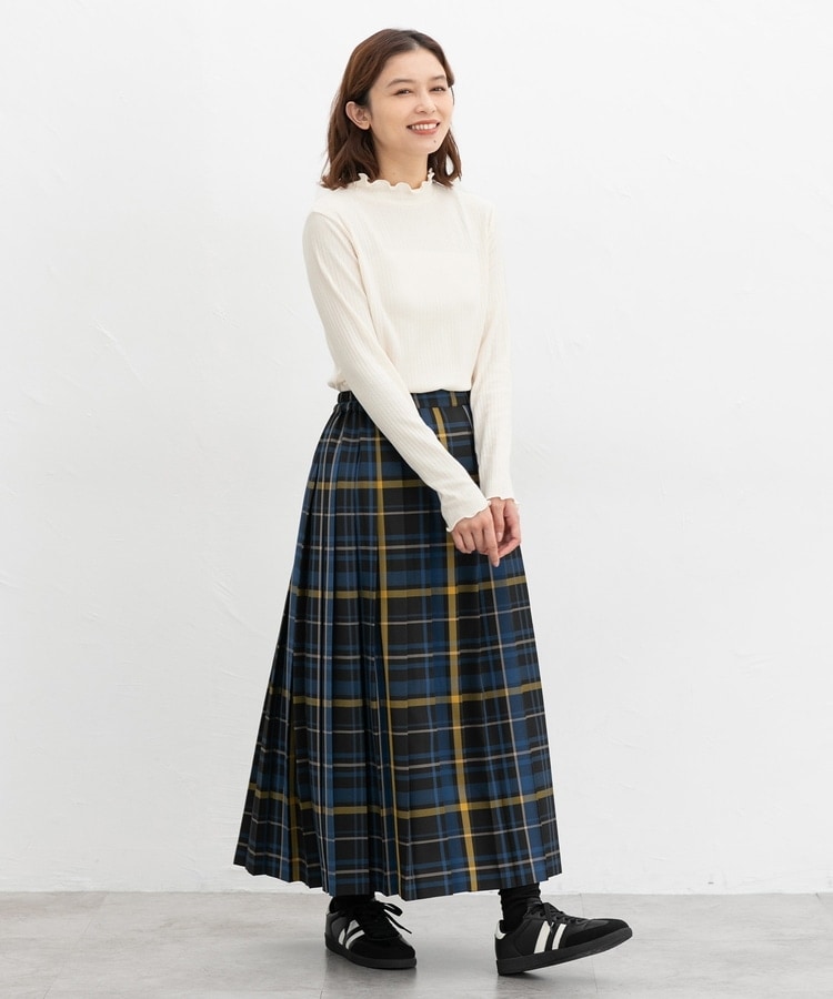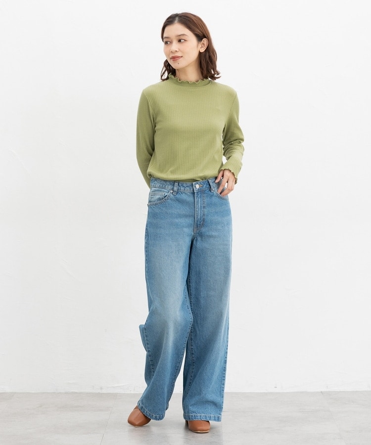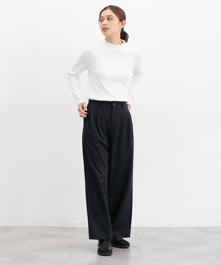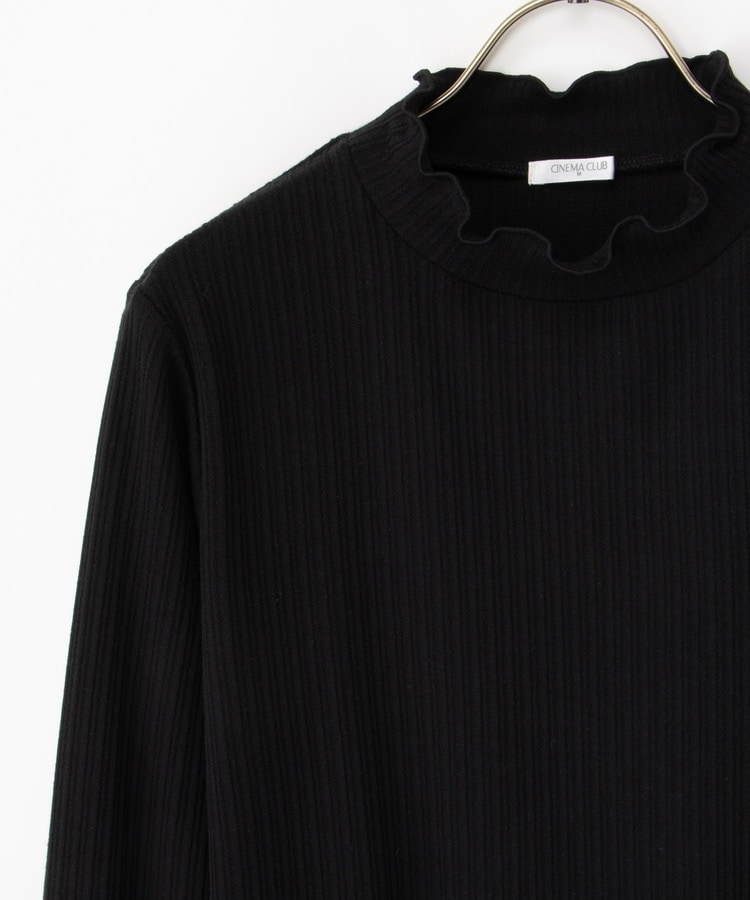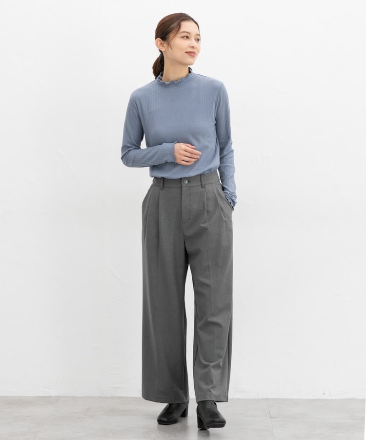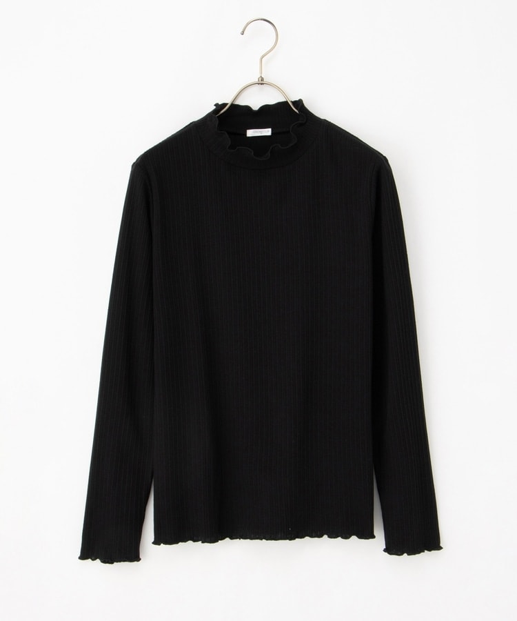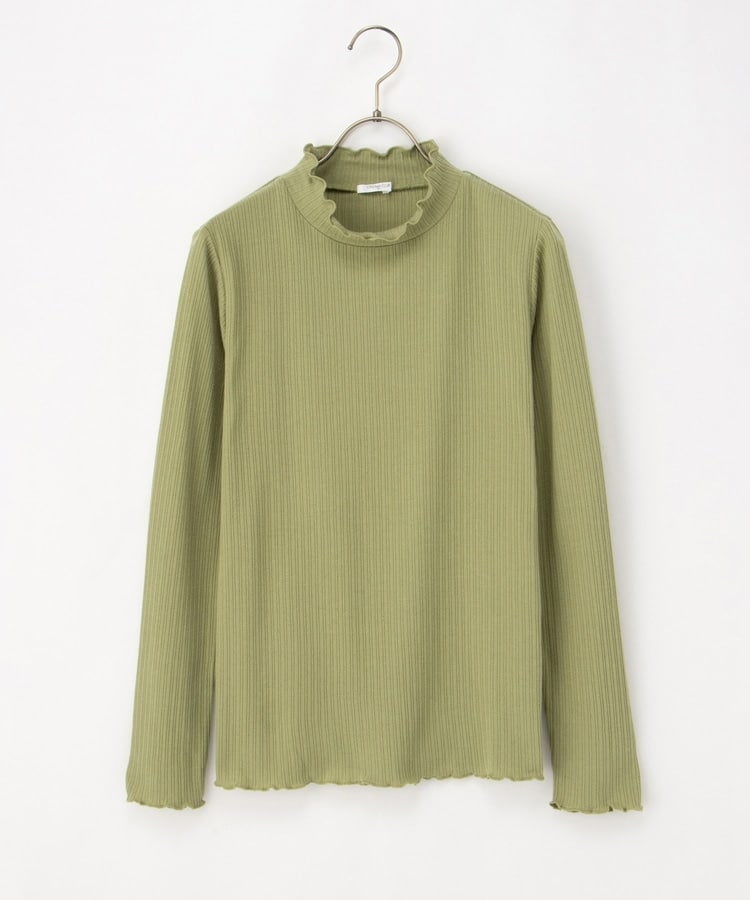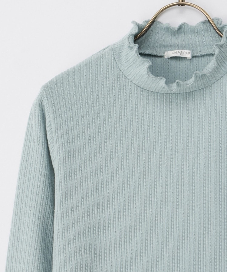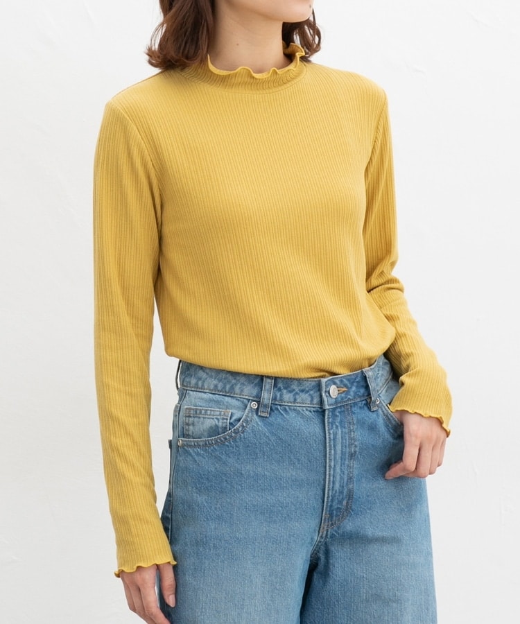 首元を隠してあったかな、程よい高さのプチハイネックに、メロー使いで洒落感もプラスしたフェミニンなデザイン。