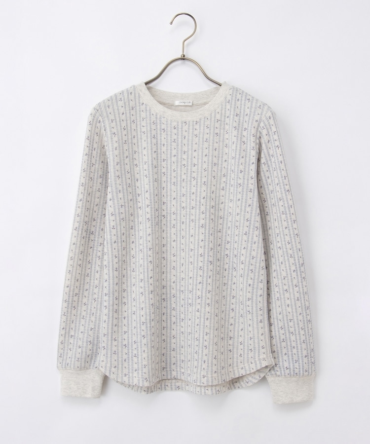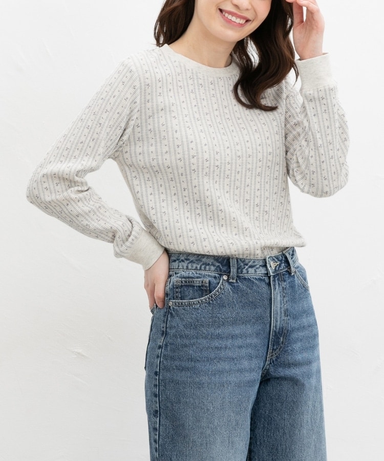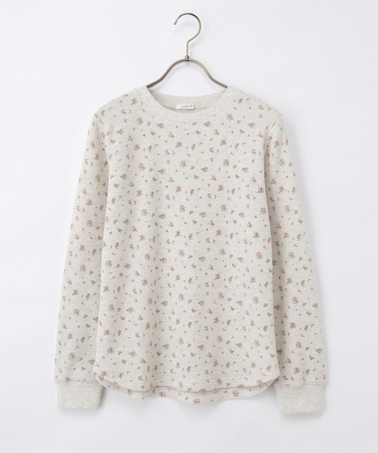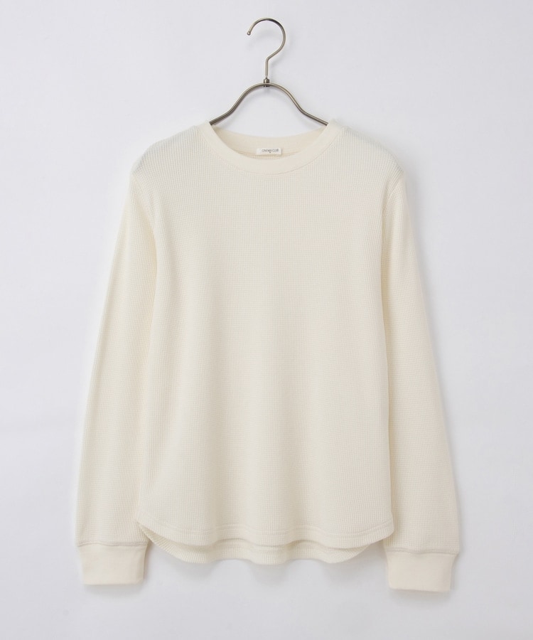 優しげなクルーネックと控えめなラウンド裾がフェミニンなデザイン。