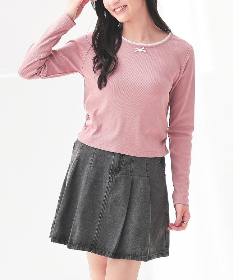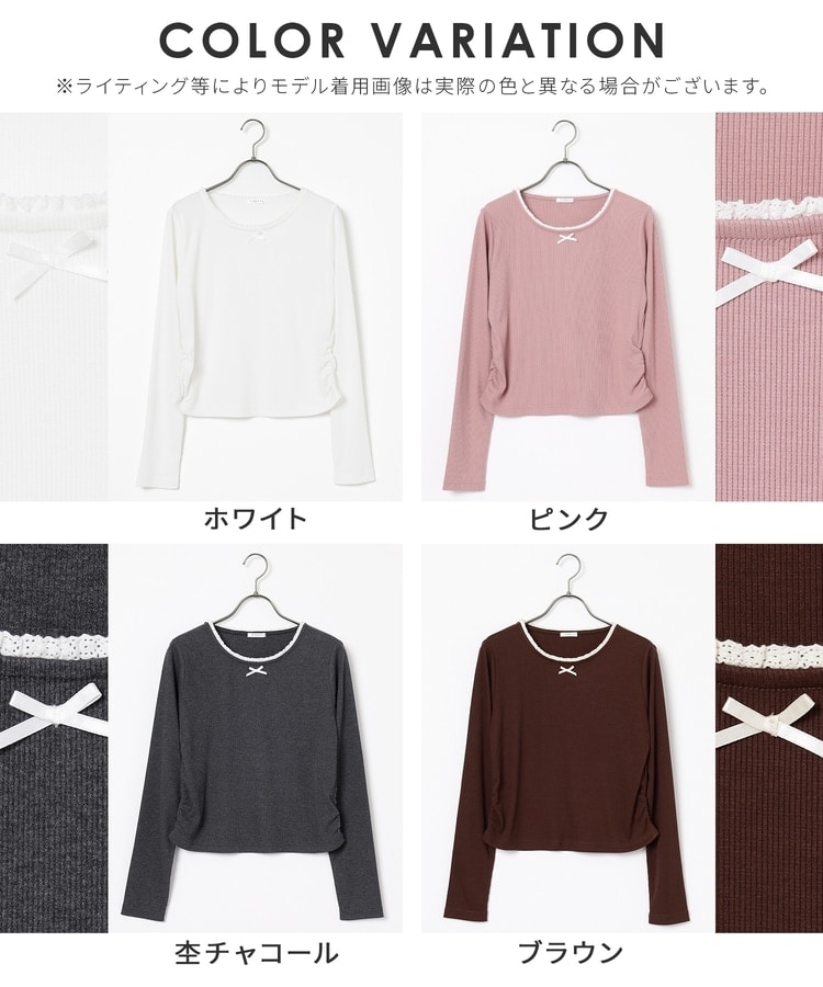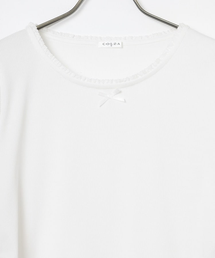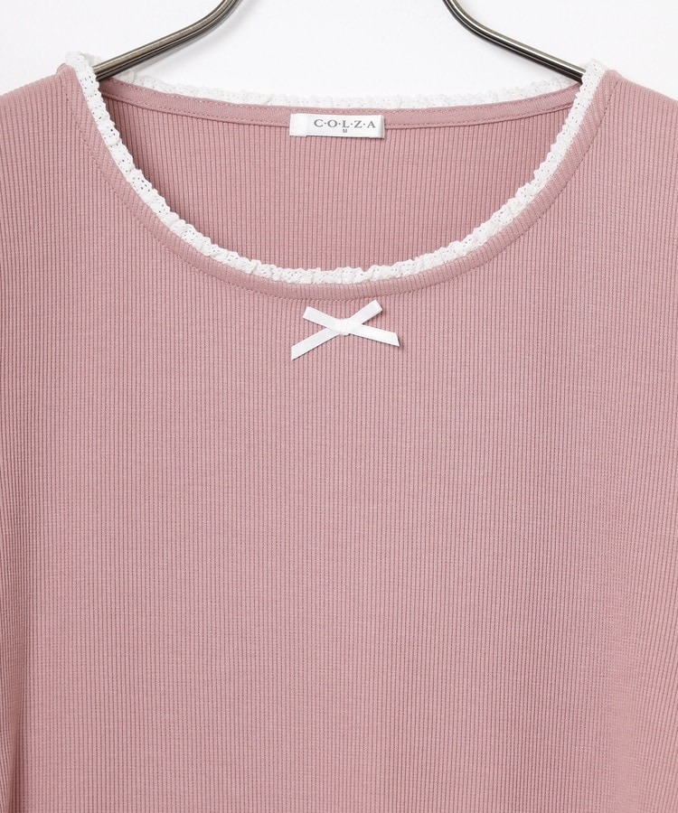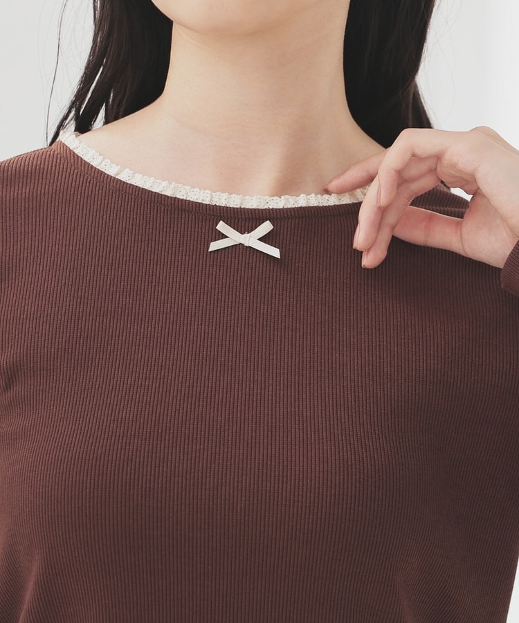衿ぐりレースと控えめリボンがフェミニンなデザイン。