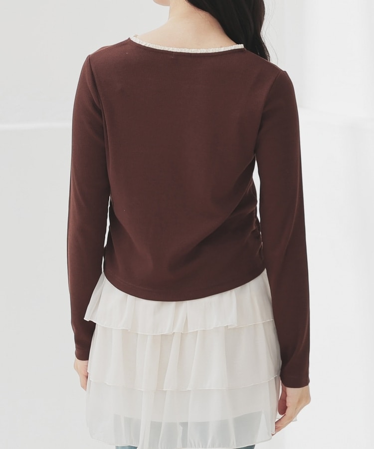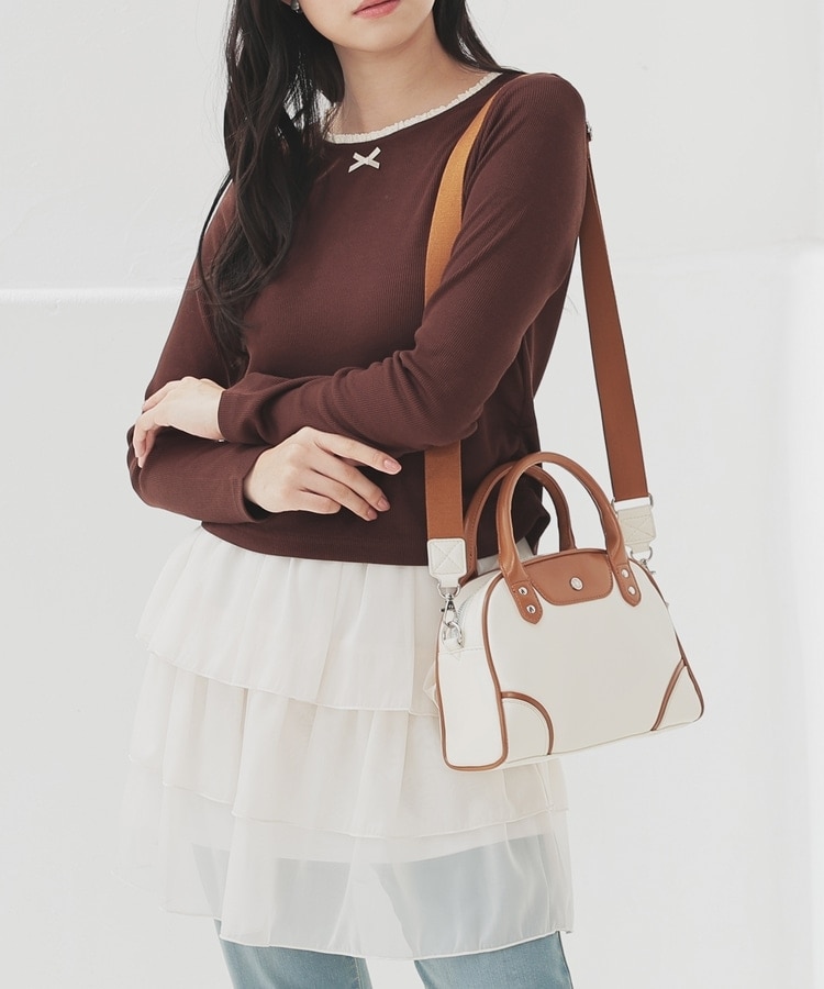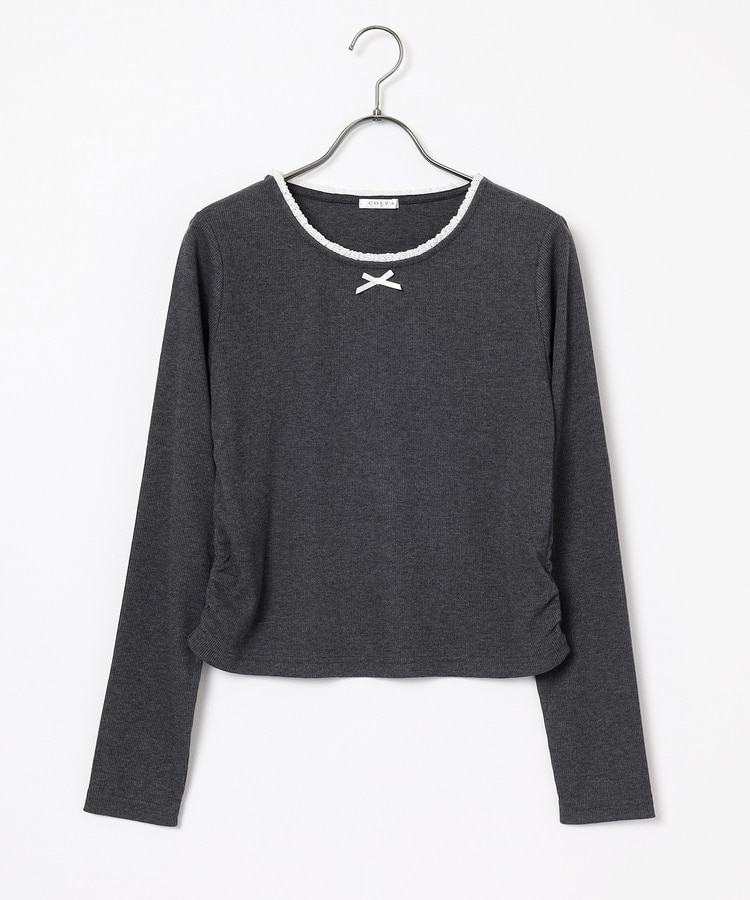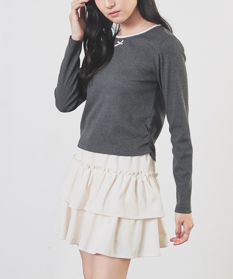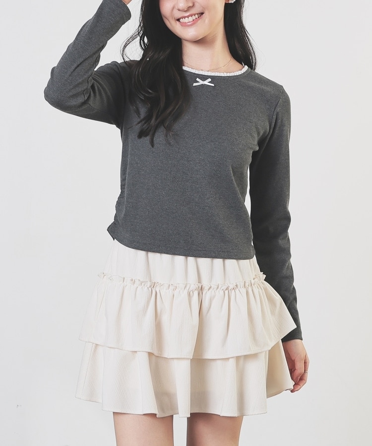 衿ぐりレースと控えめリボンがフェミニンなデザイン。