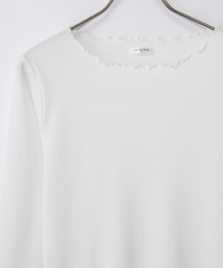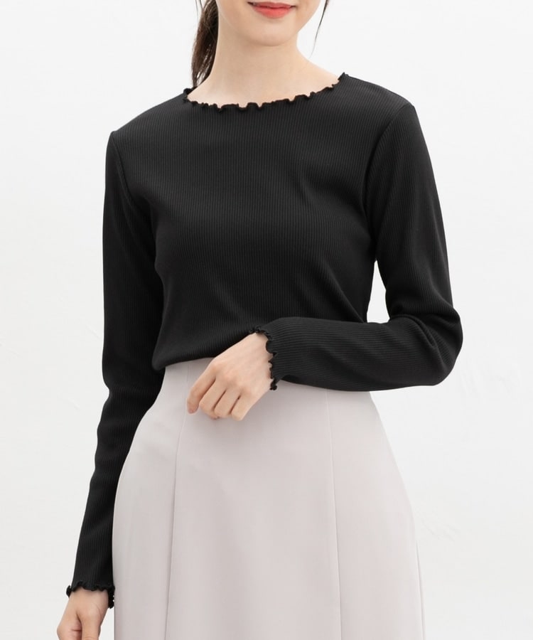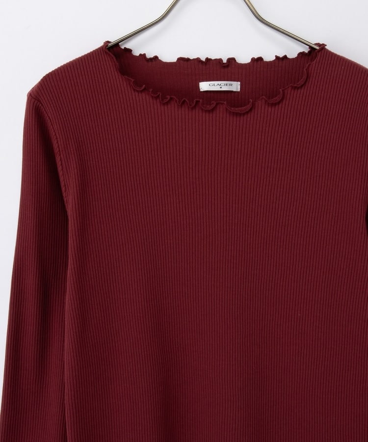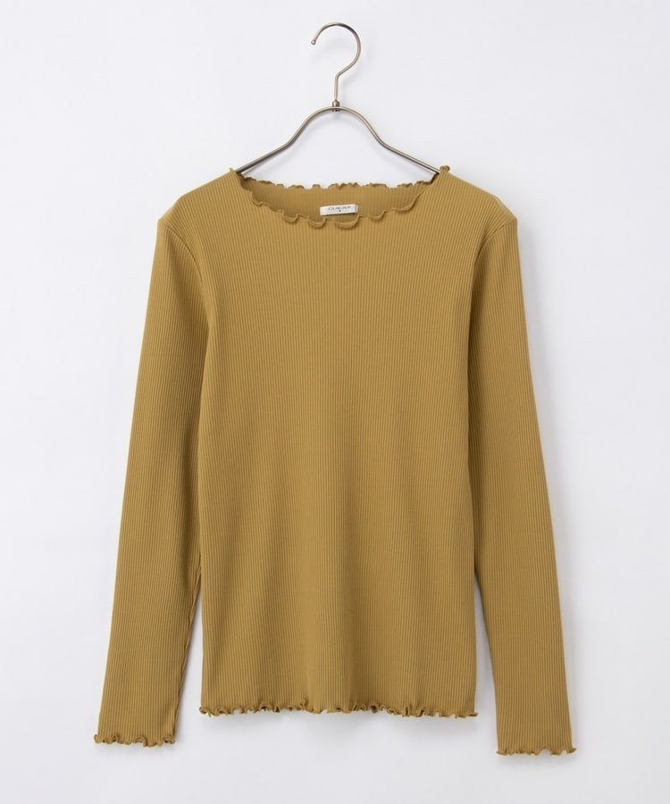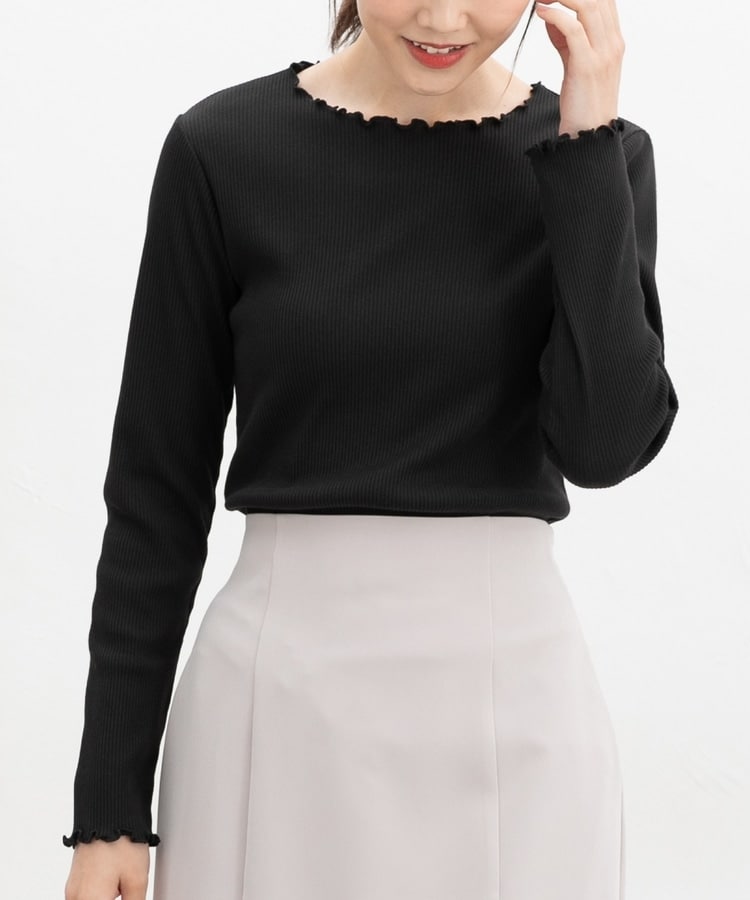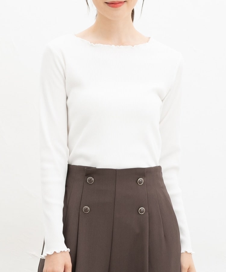 シンプルながら衿元や裾・袖口のメロー使いが大人可愛いデザイン。