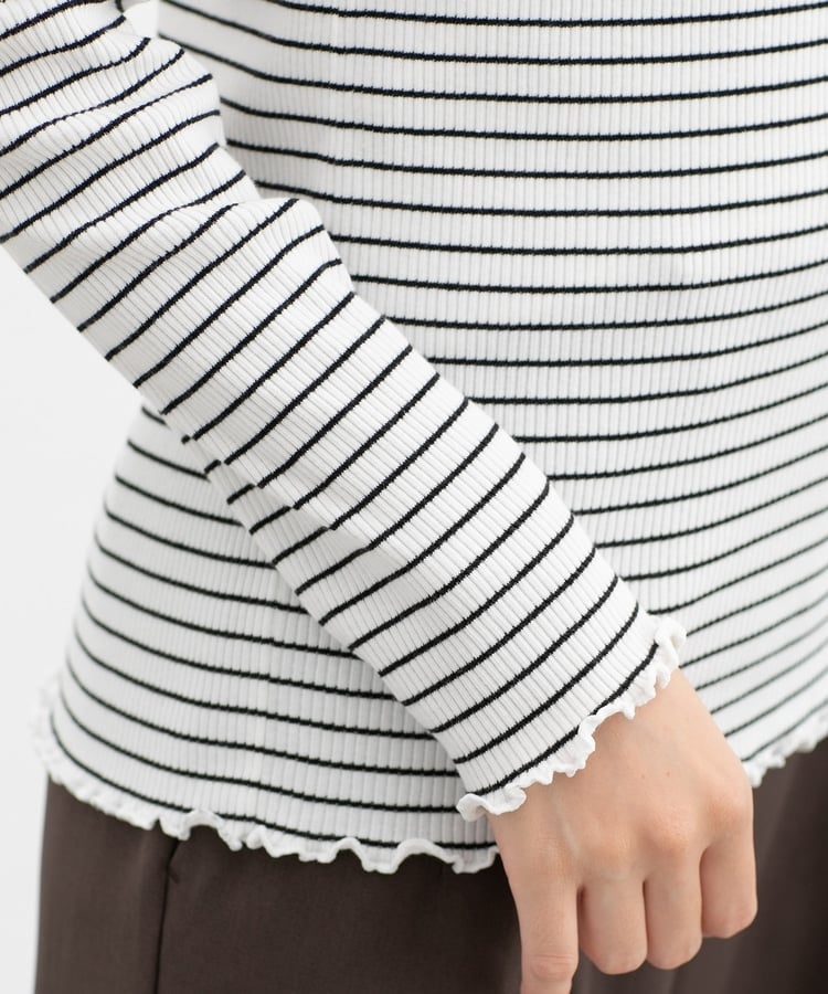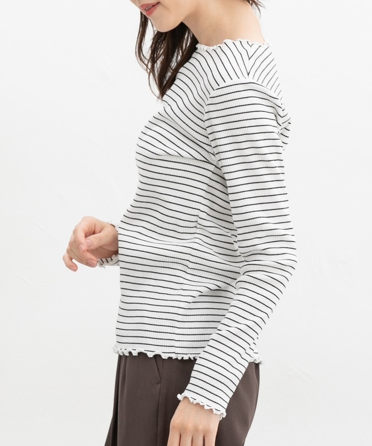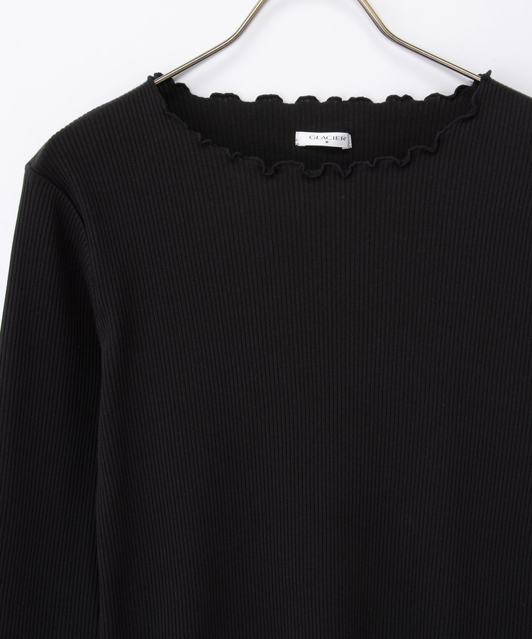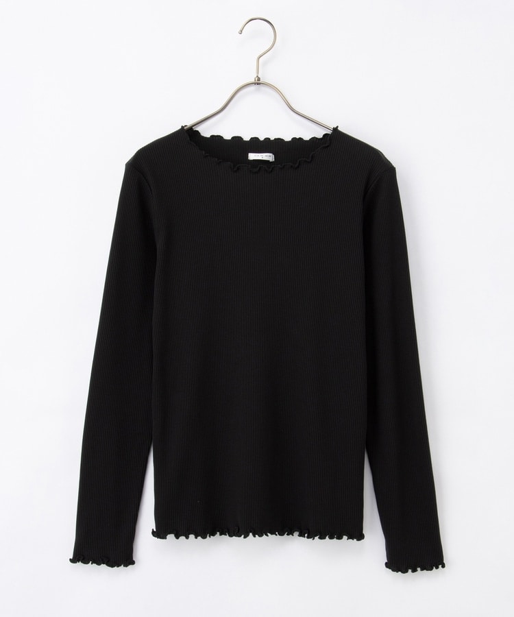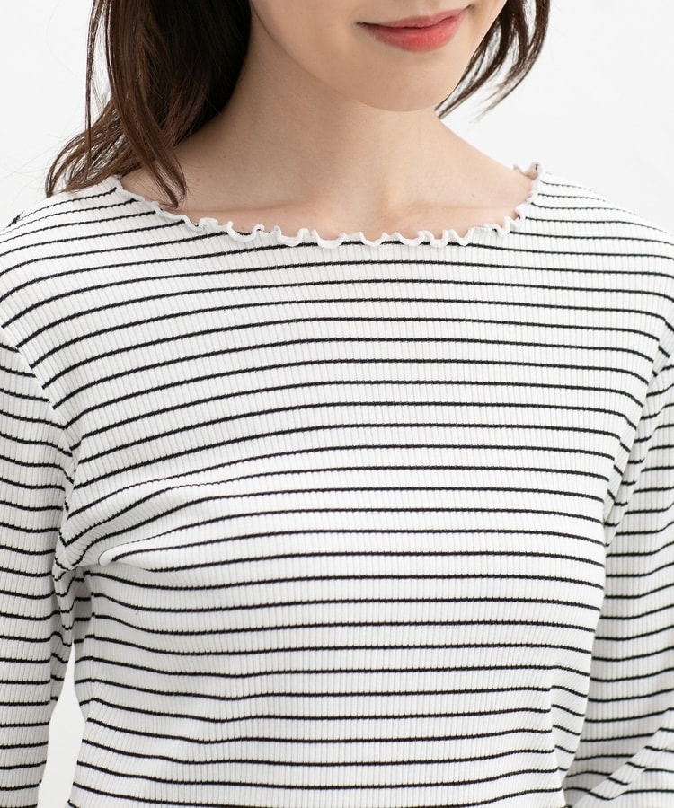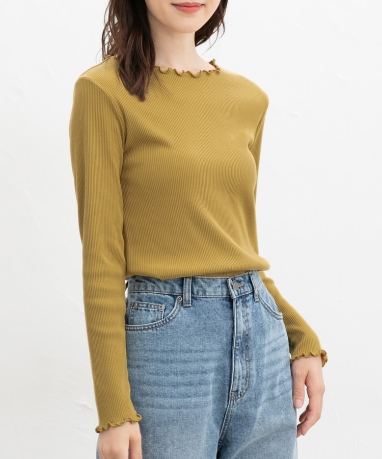 シンプルながら衿元や裾・袖口のメロー使いが大人可愛いデザイン。
