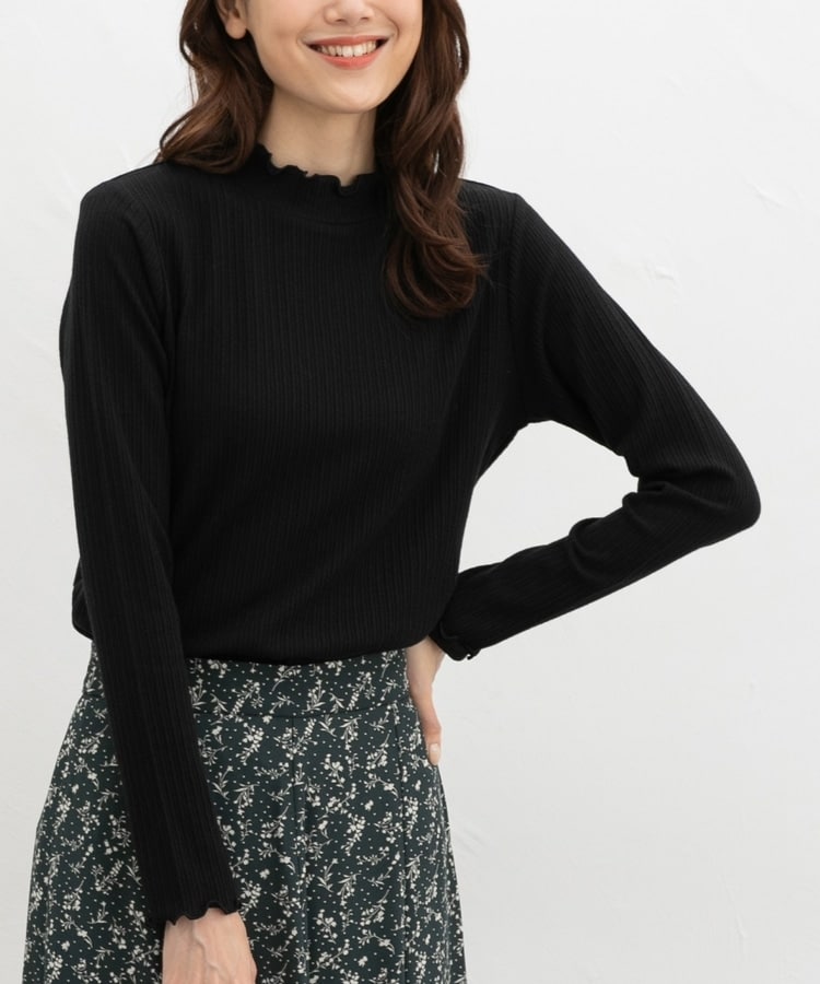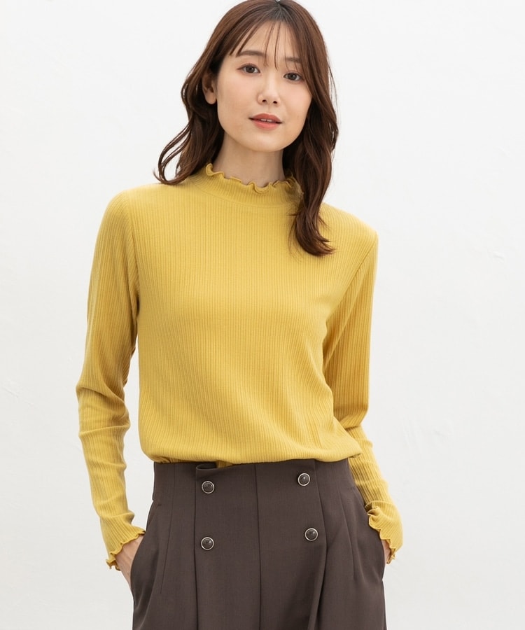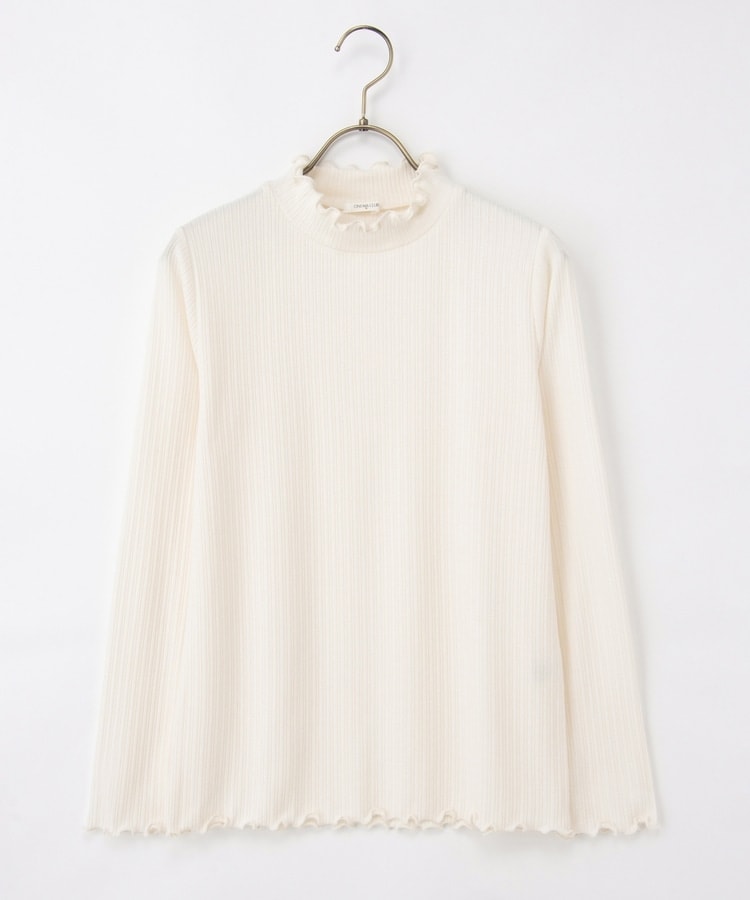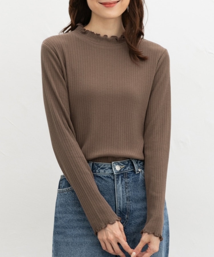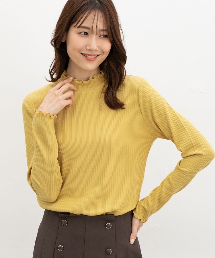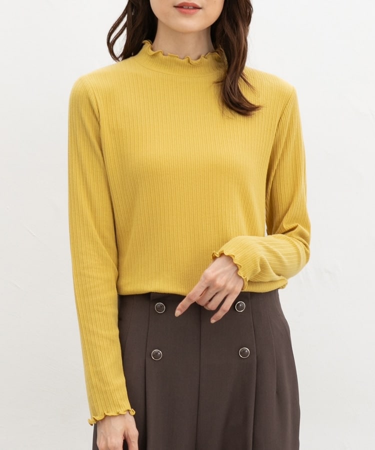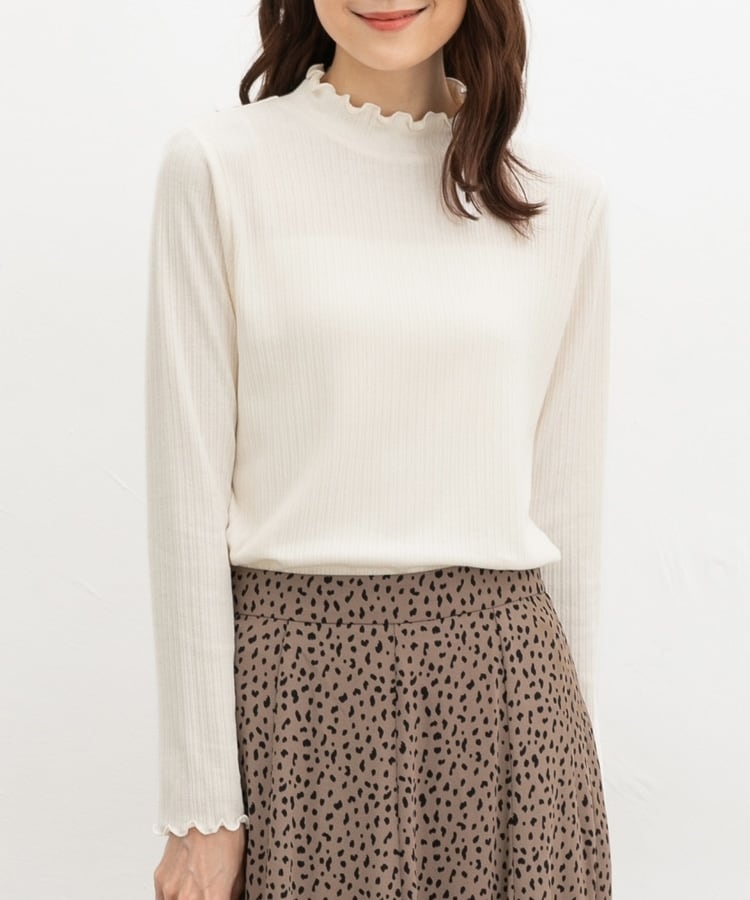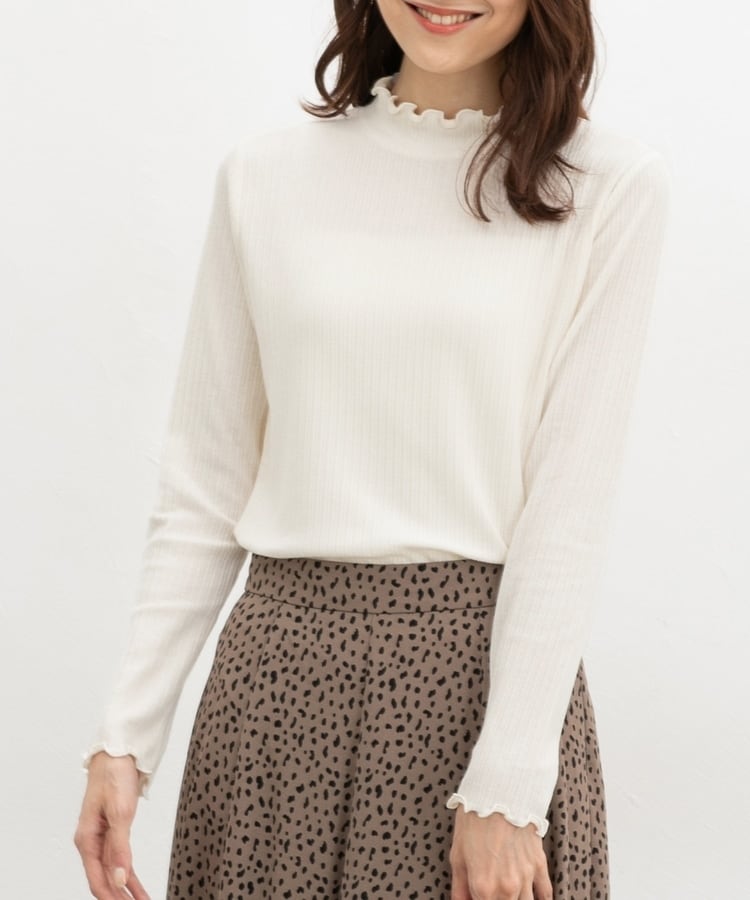 首元を隠してあったかな、程よい高さのプチハイネックに、メロー使いで洒落感もプラスしたフェミニンなデザイン。