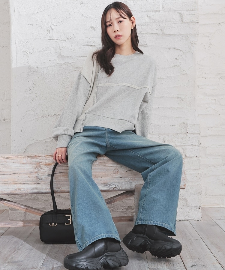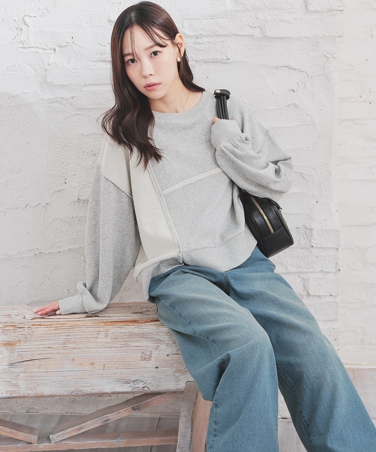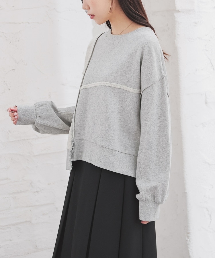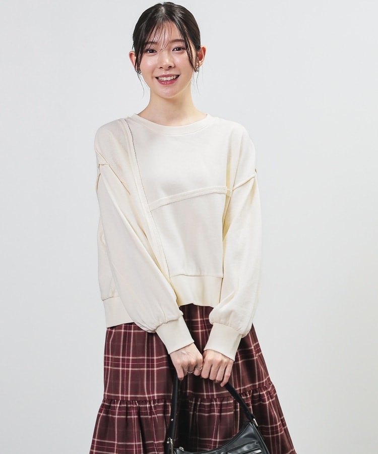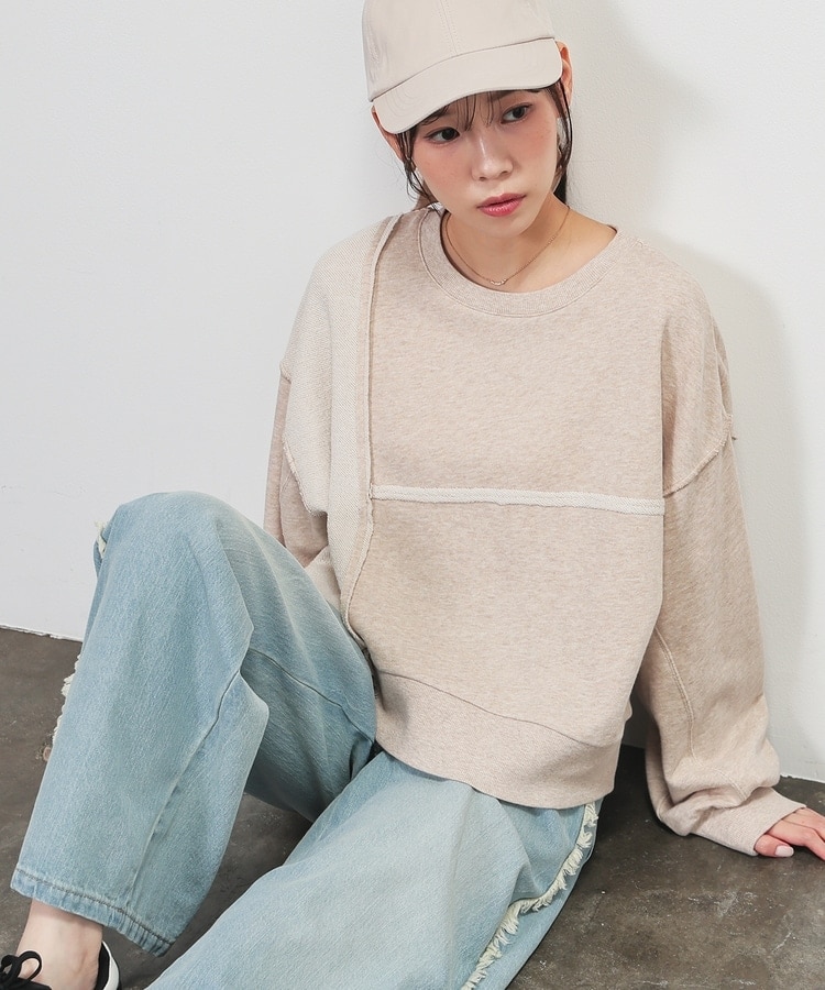 部分的に生地の裏側や縫い目を表側にして、リメイク風に仕上げた、こなれ感のあるデザイン。