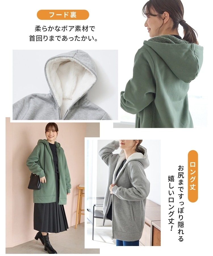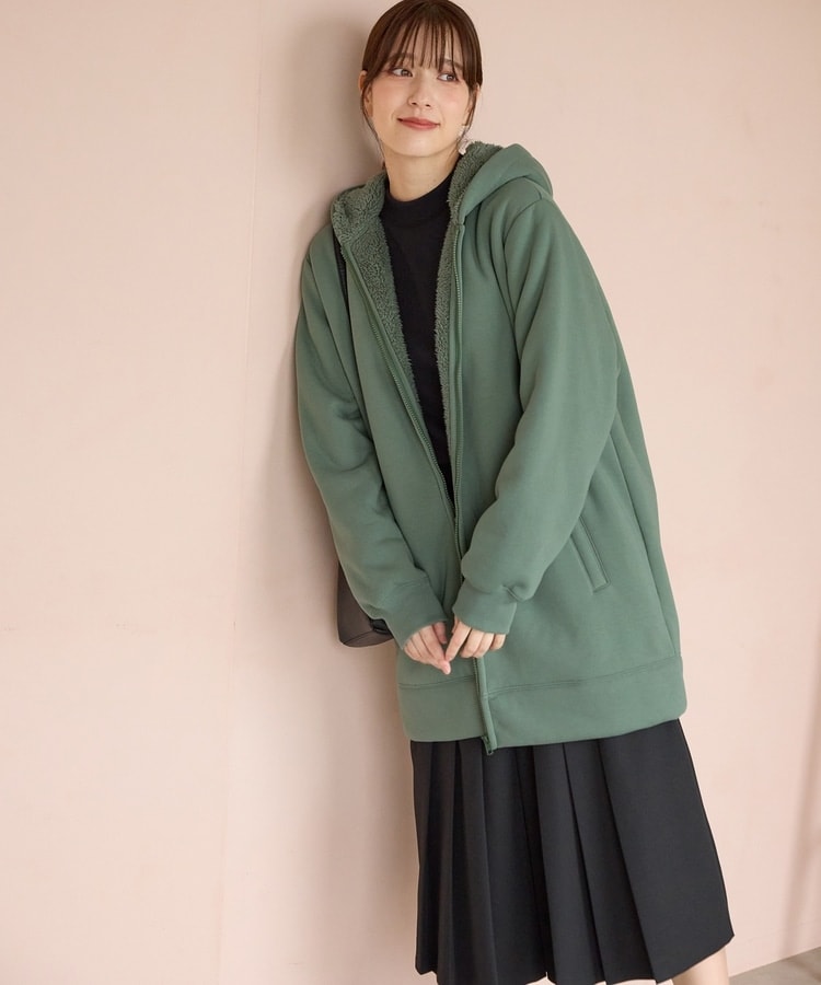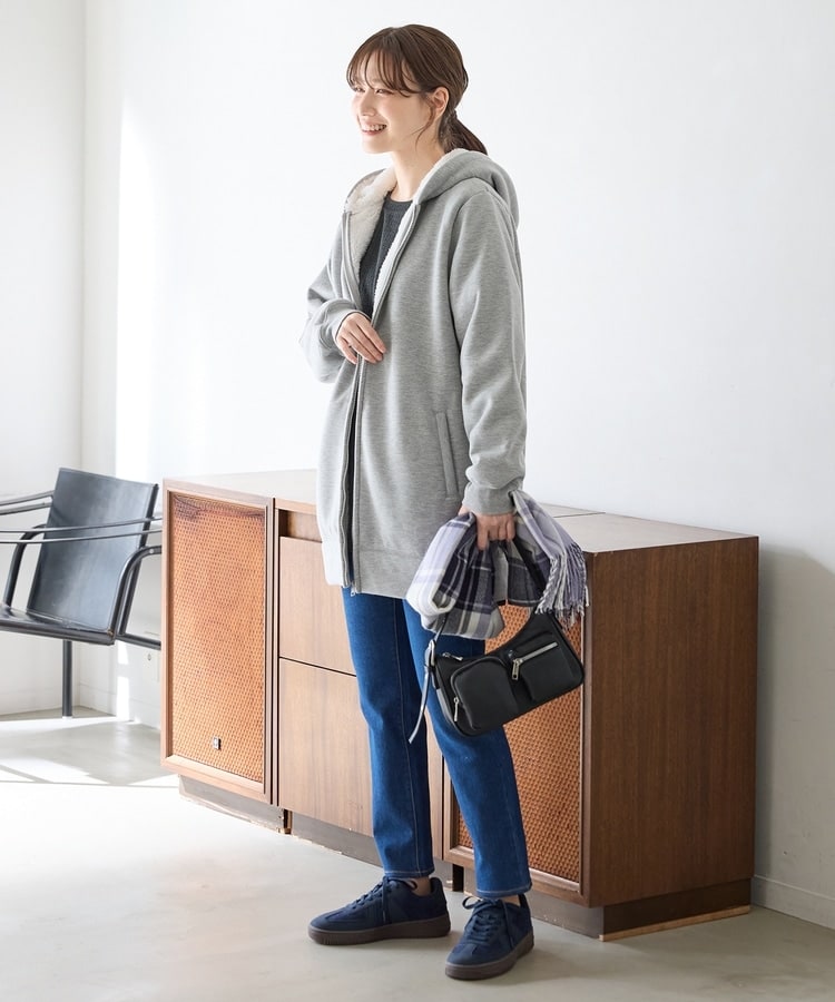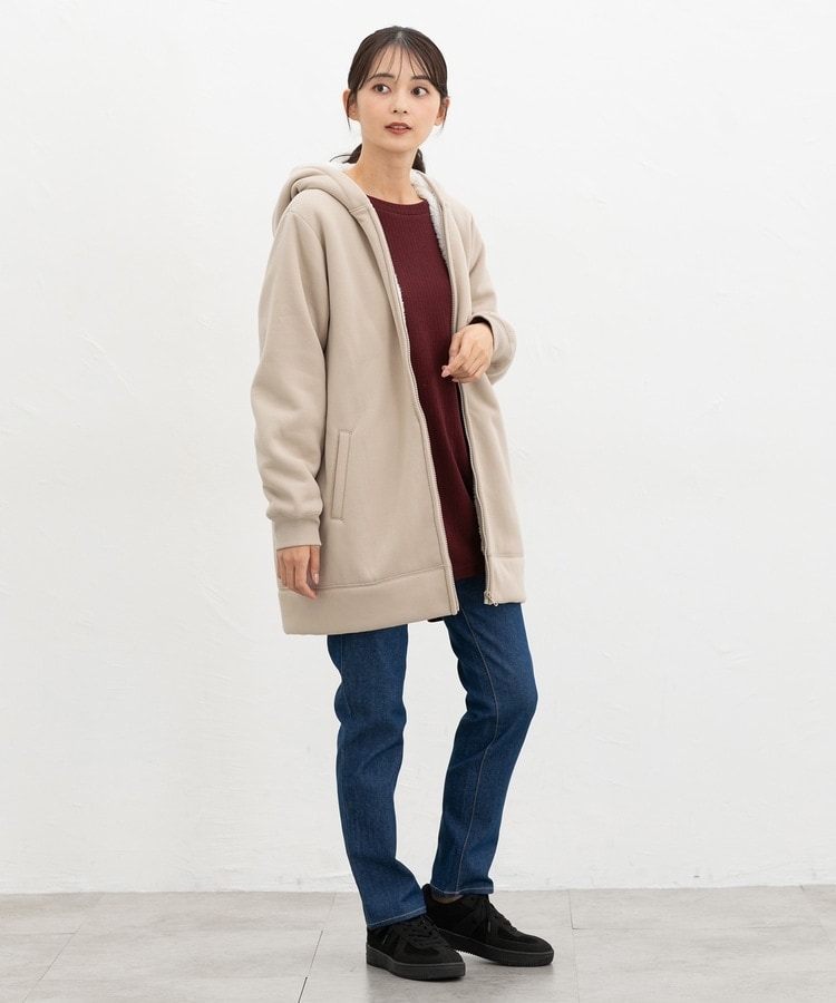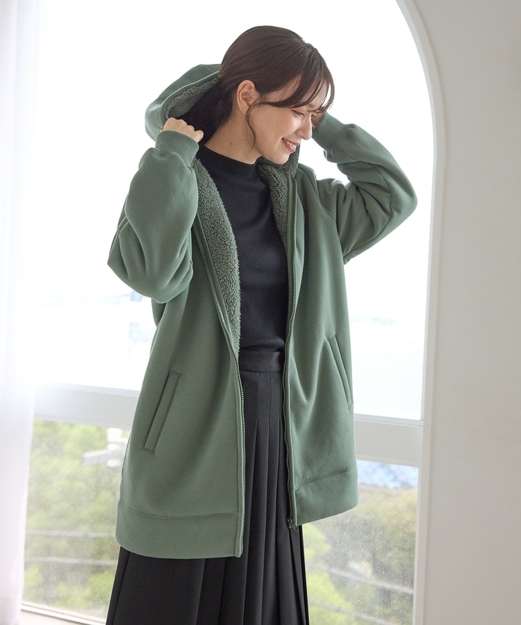 重ね着もしやすいゆったり幅とヒップがすっぽり隠れる長めの丈で、さらにあったかさアップ♪