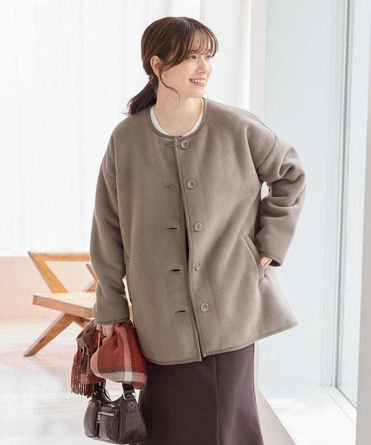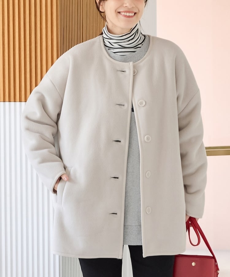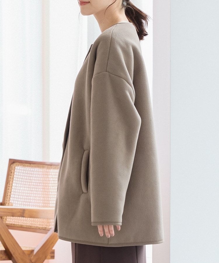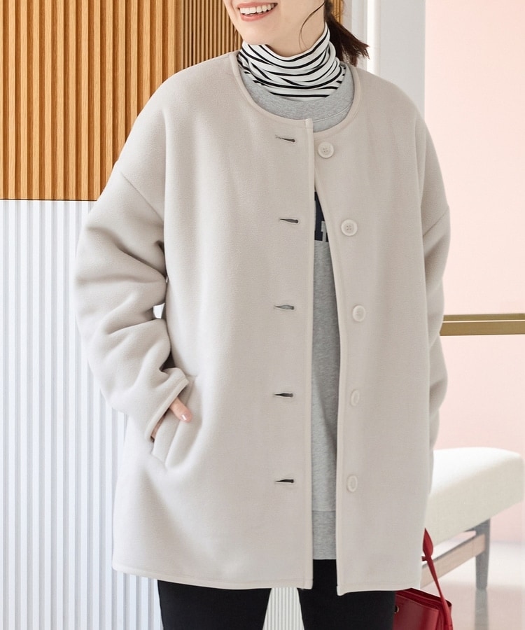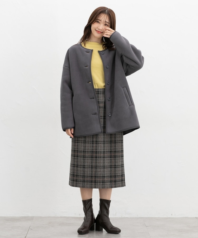 ニットやスウェットなどの上にも羽織りやすい、ゆったり幅とヒップまですっぽり隠れる丈感のリラクシーなシルエットで、体型もカバー。