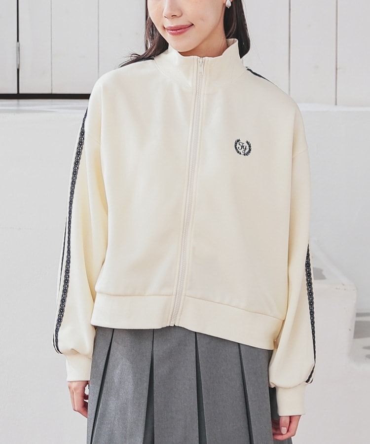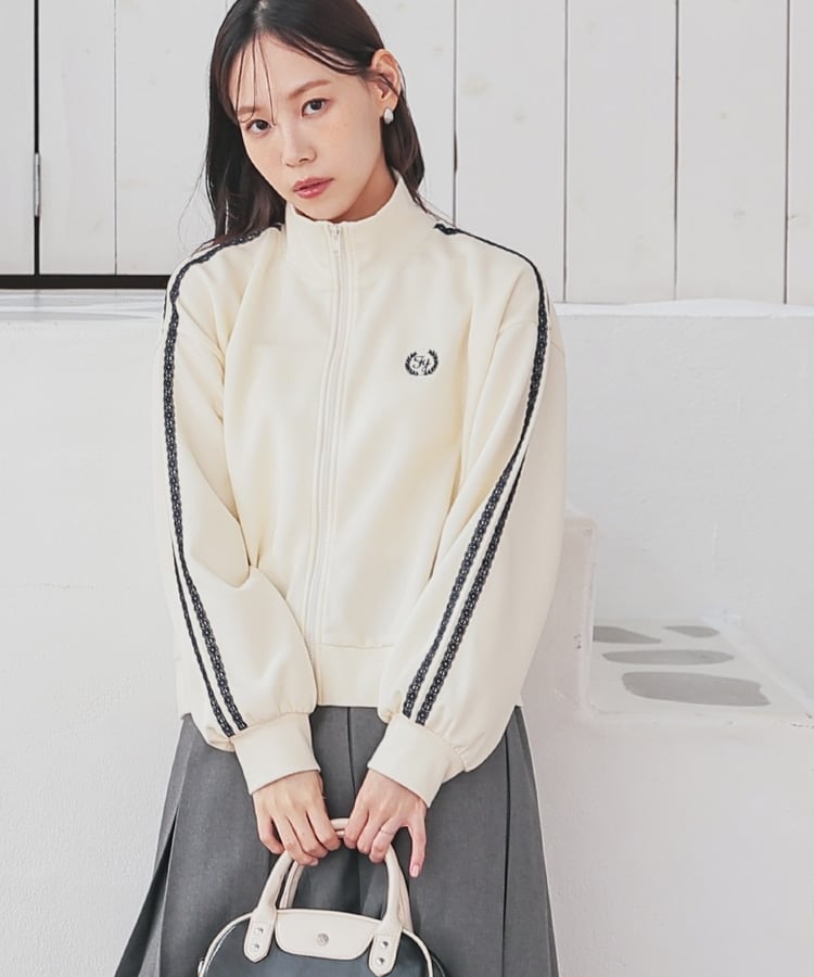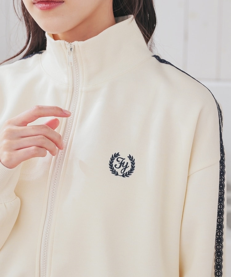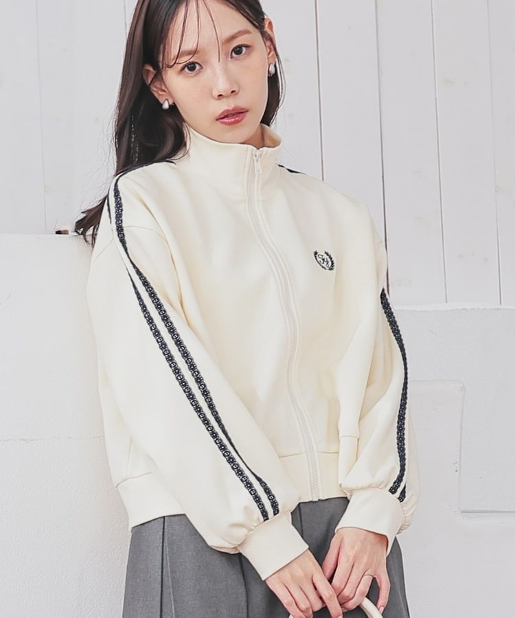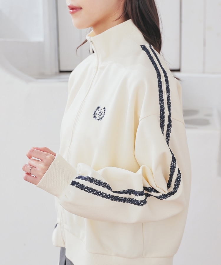 スポーティーなトラックジャケットの袖ラインにレースを使い、甘さをプラスしたデザイン。