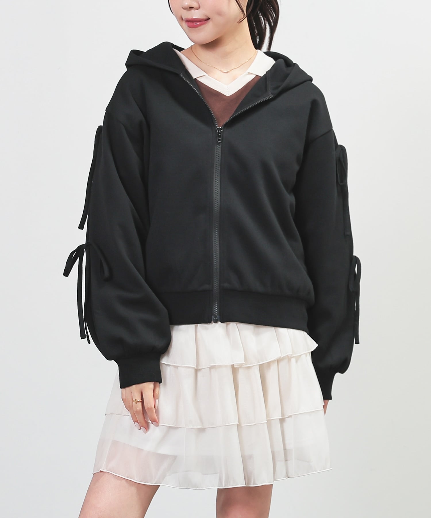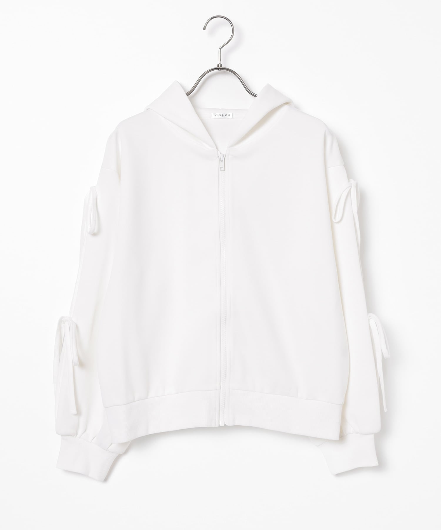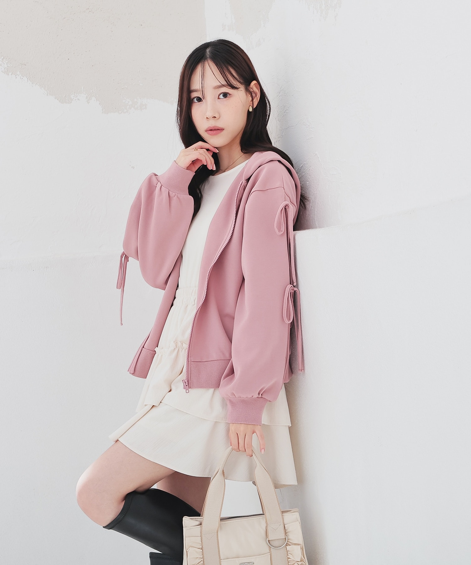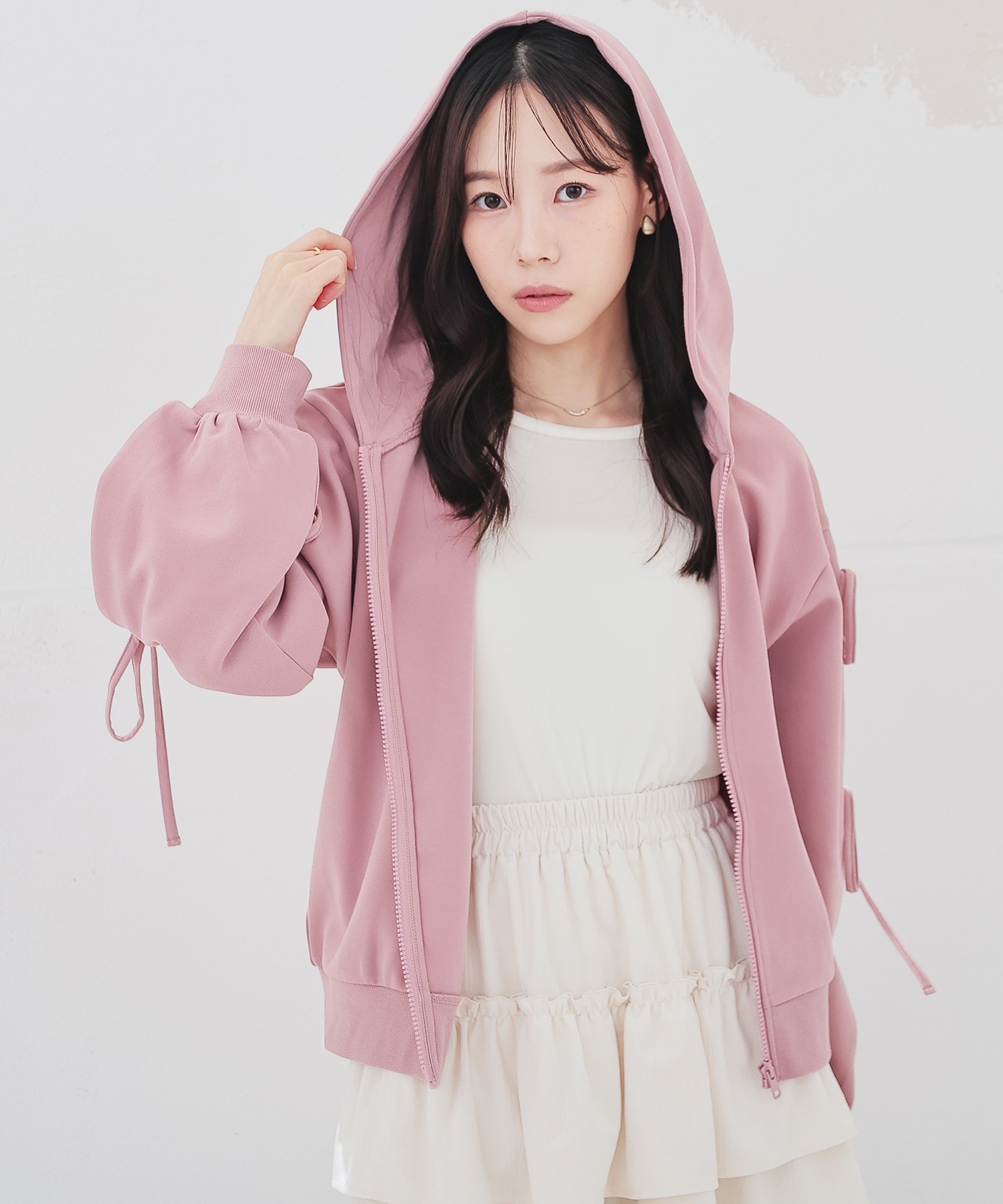 シンプルなジップパーカーの袖に、甘すぎない同色リボンをプラスしたキュートなデザイン。