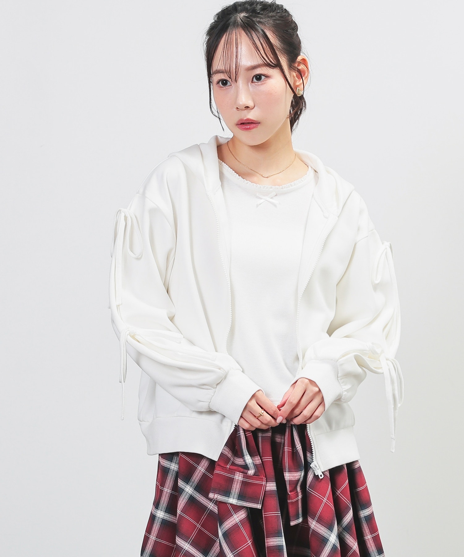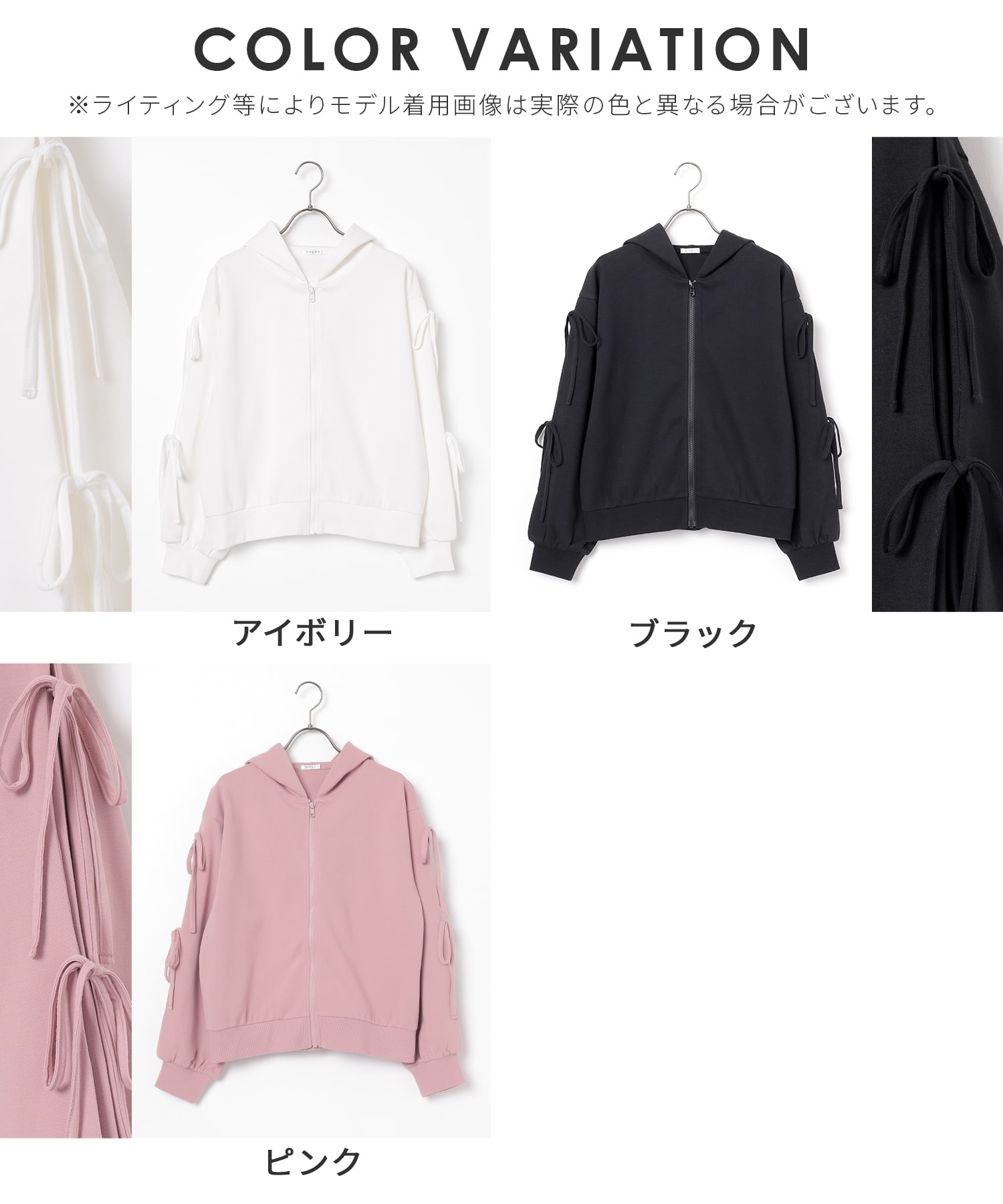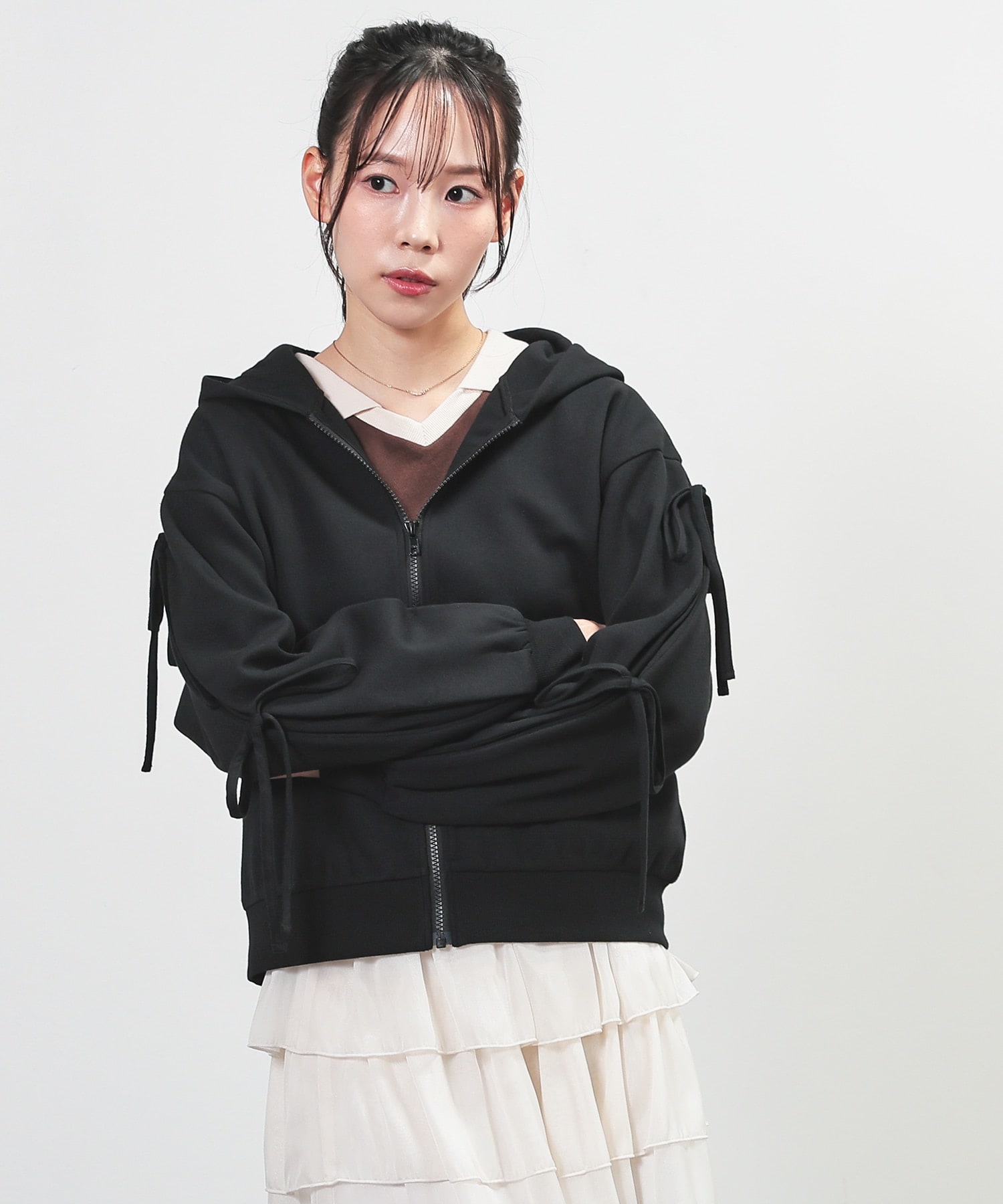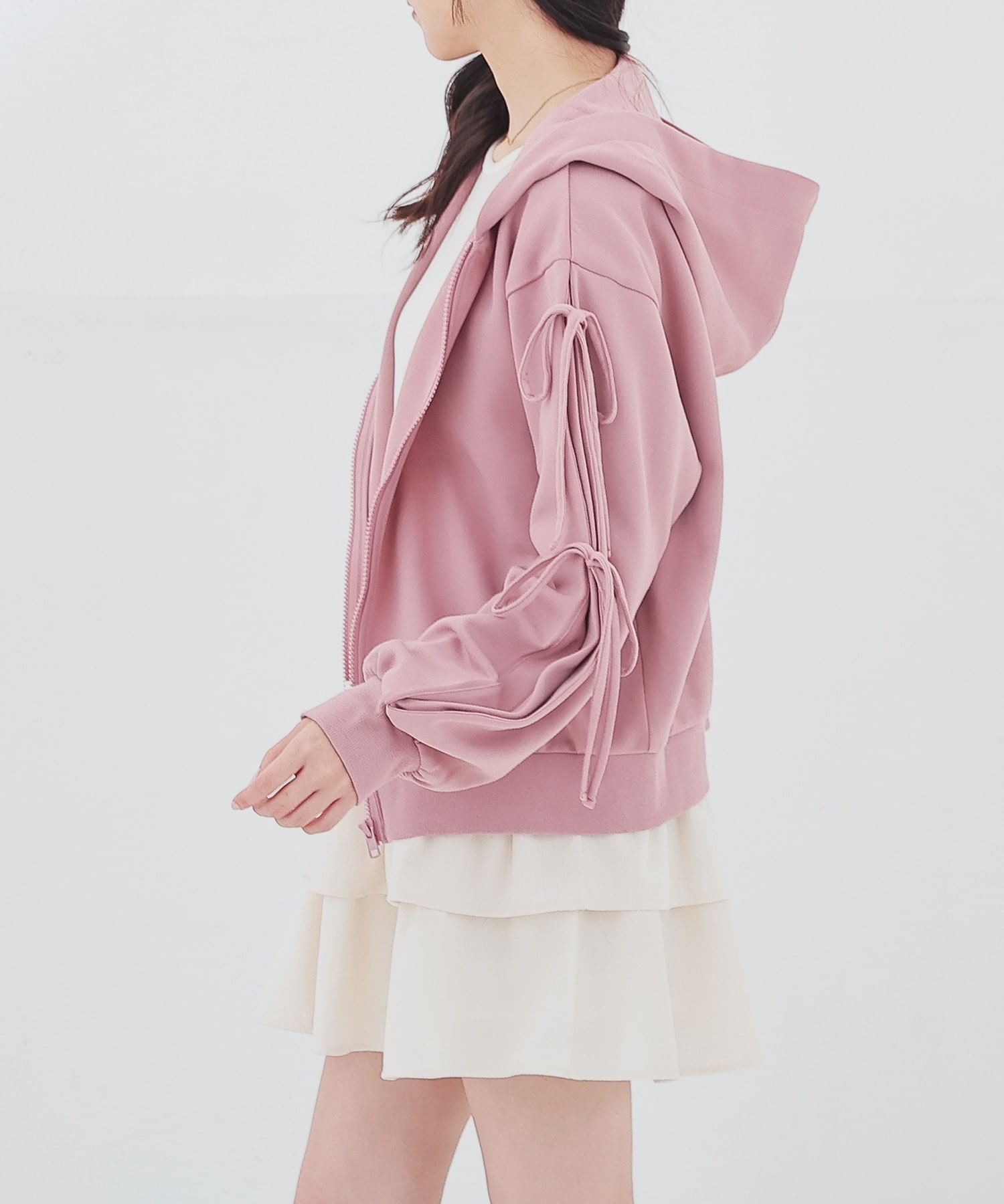シンプルなジップパーカーの袖に、甘すぎない同色リボンをプラスしたキュートなデザイン。