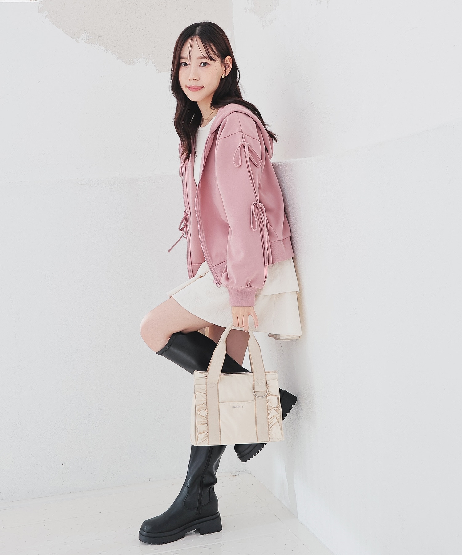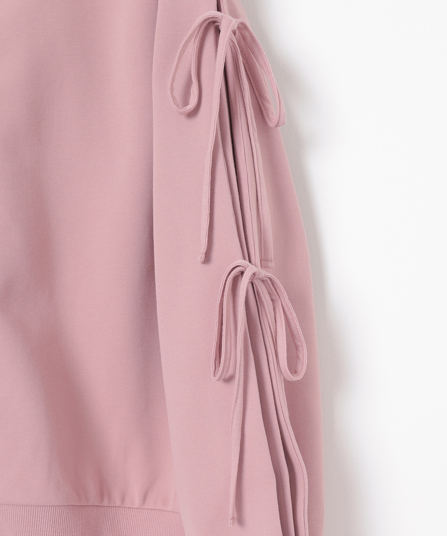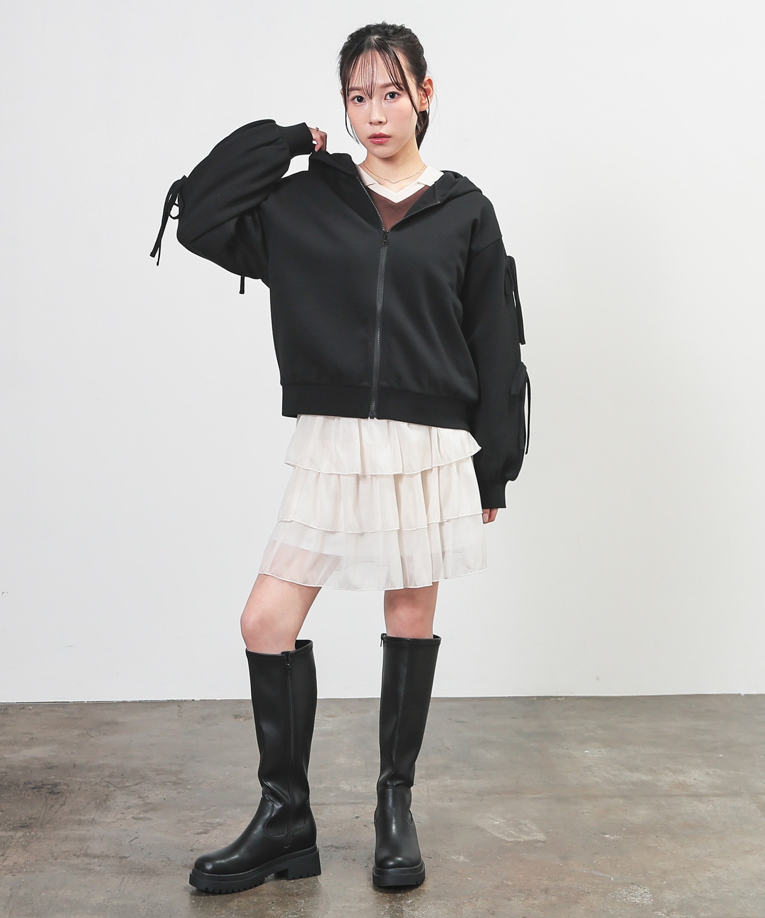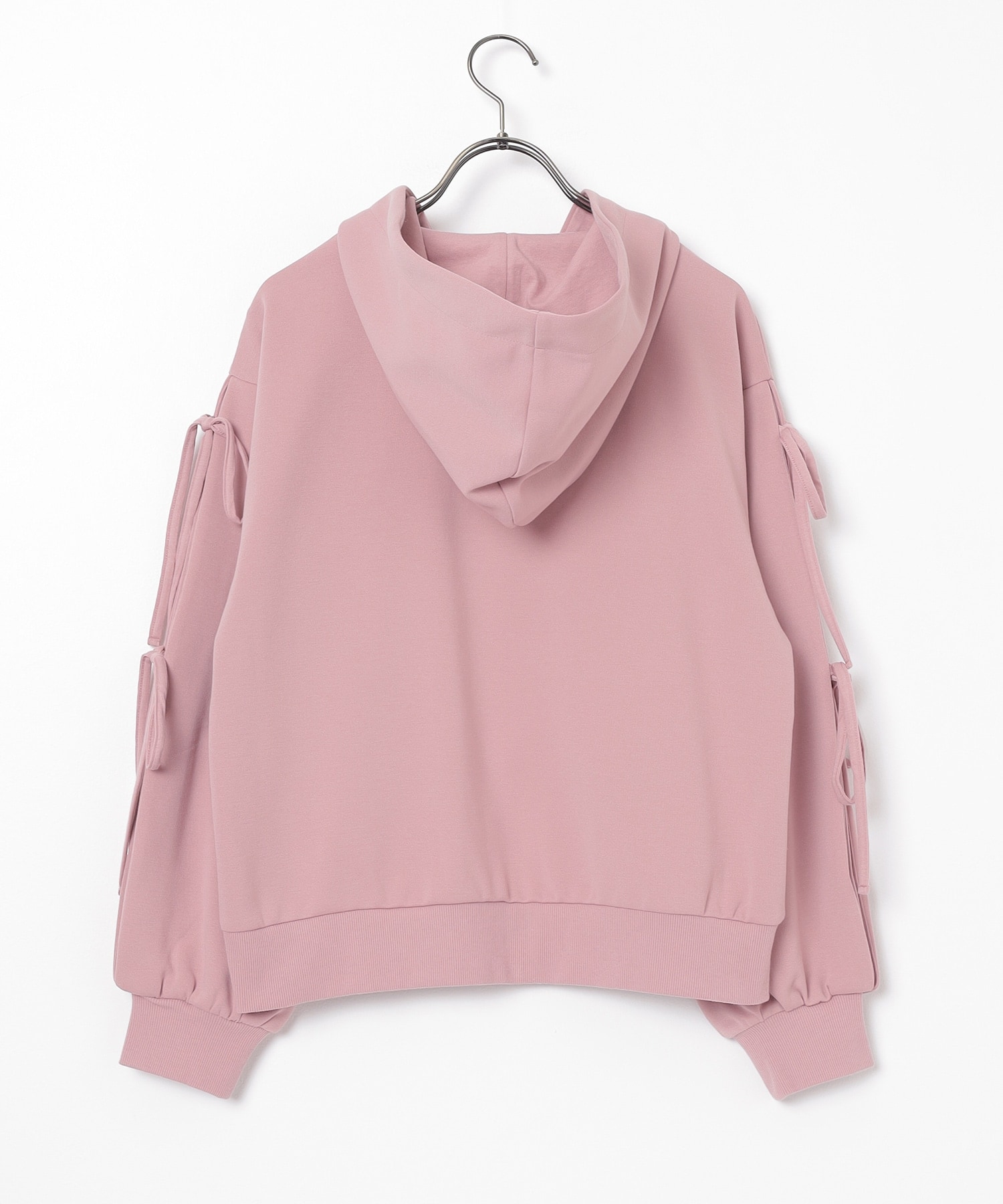 シンプルなジップパーカーの袖に、甘すぎない同色リボンをプラスしたキュートなデザイン。