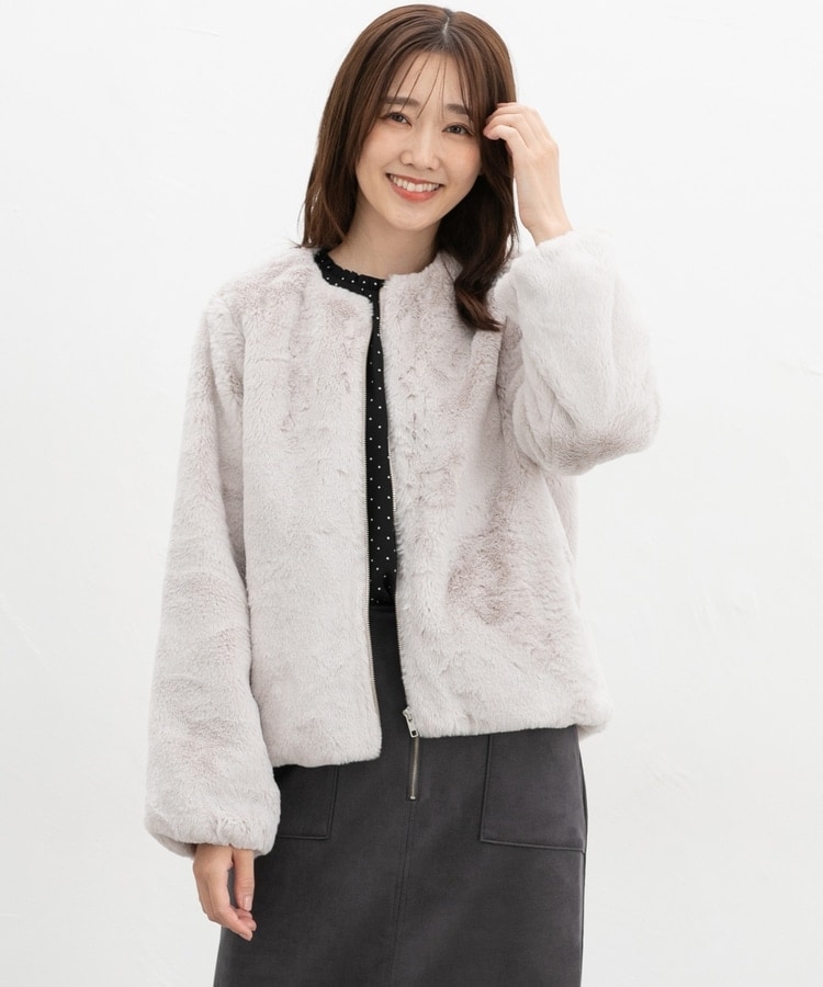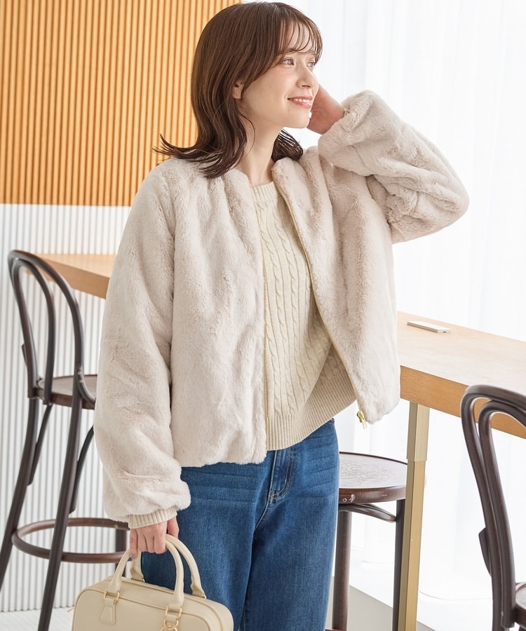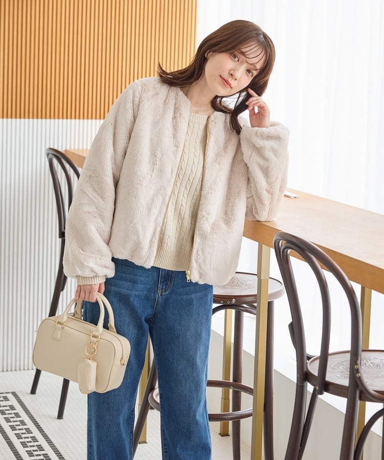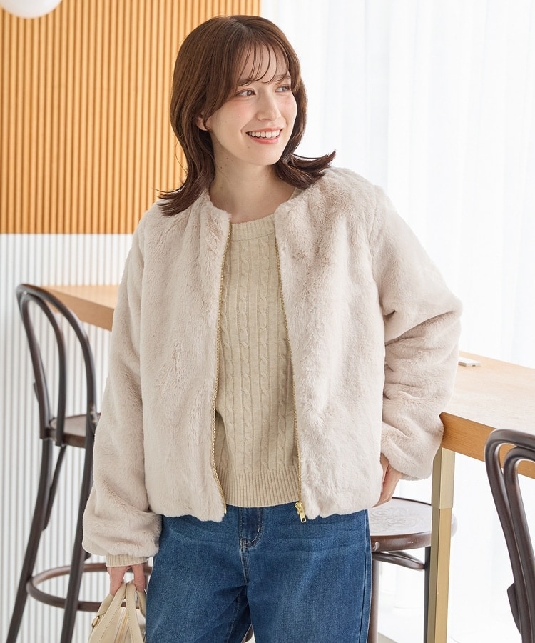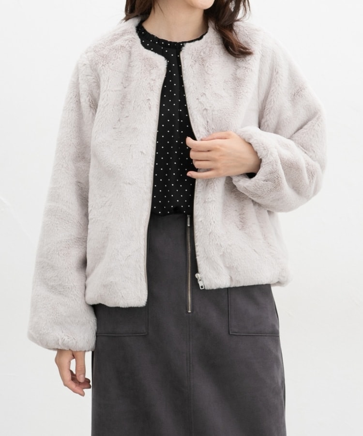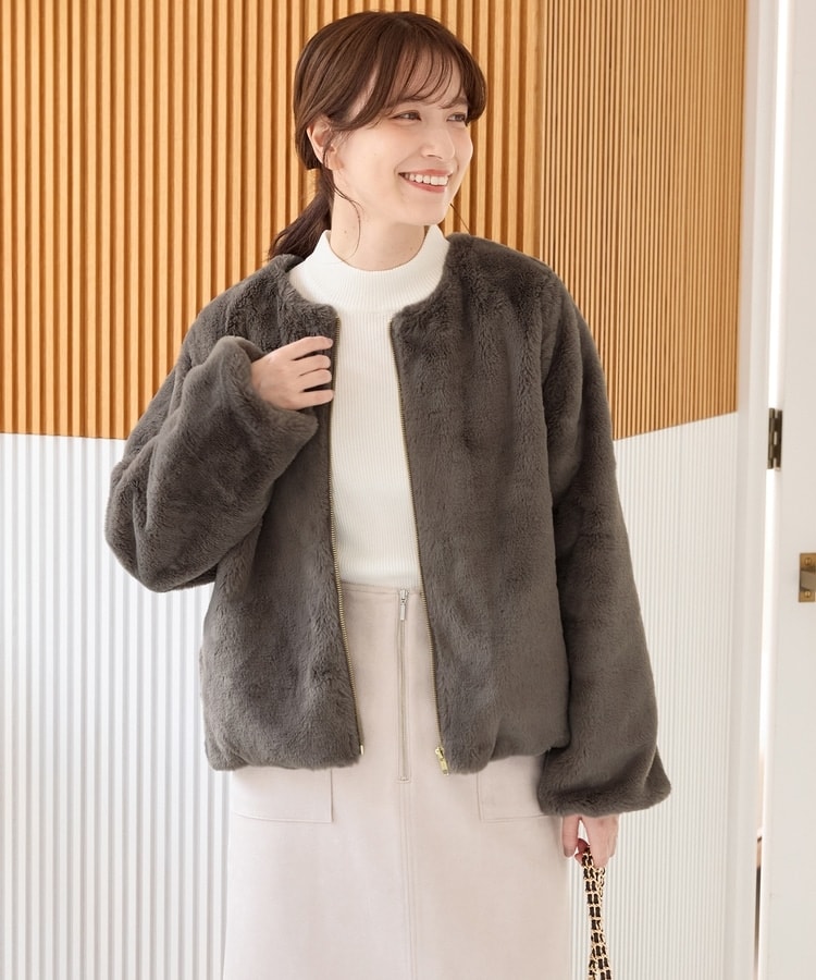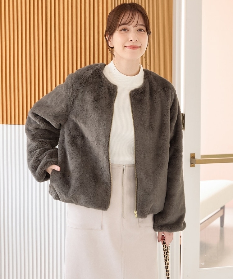 ボリュームが出がちなファーブルゾンをノーカラーでスッキリ仕上げた、上品見えするデザイン。