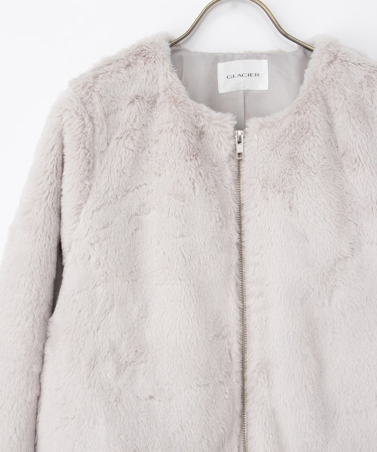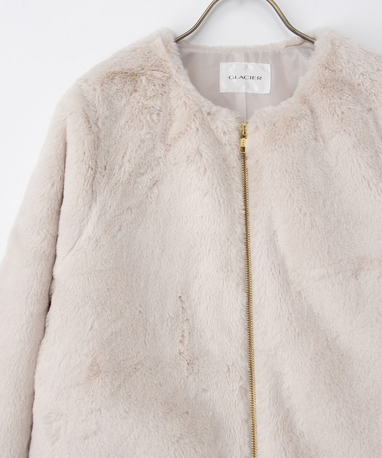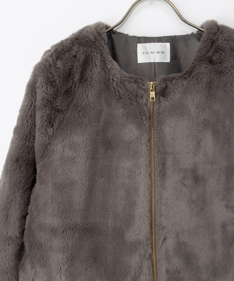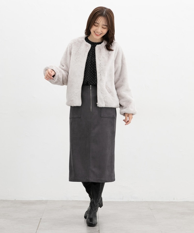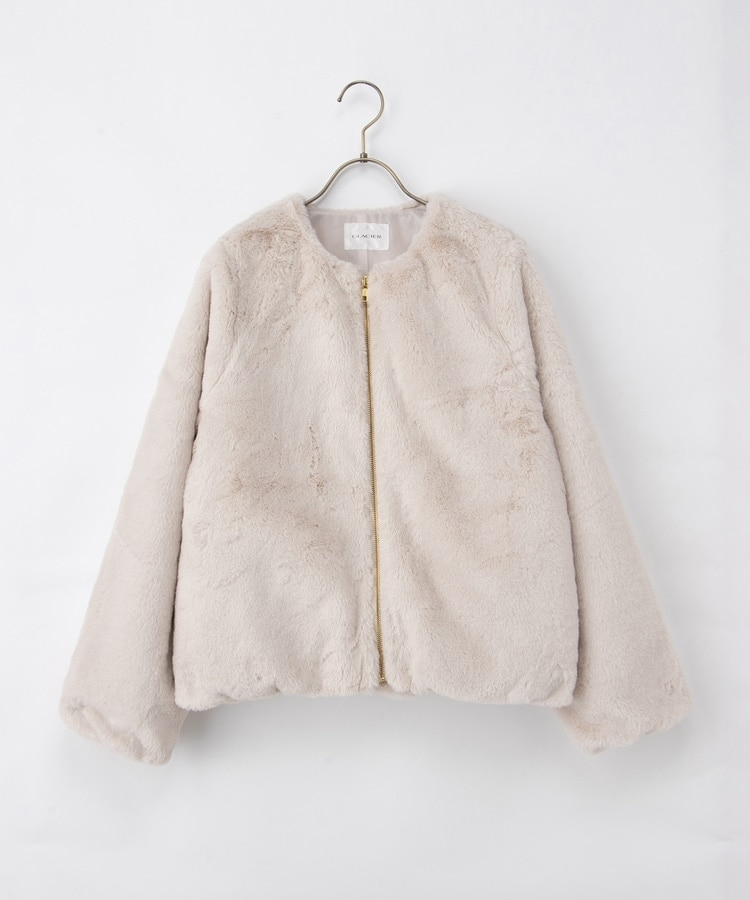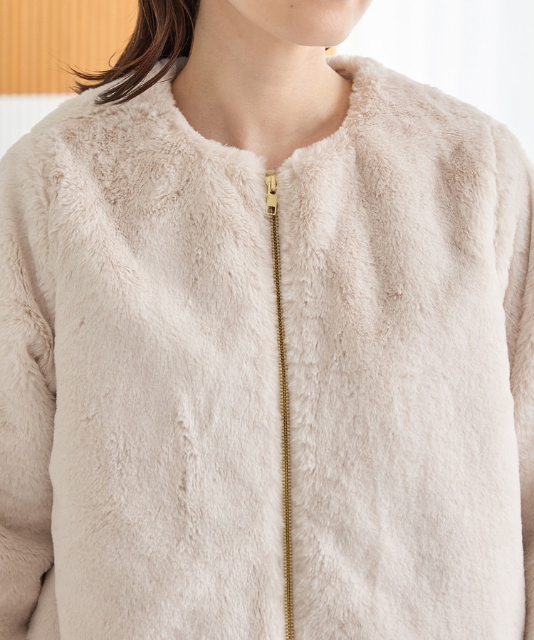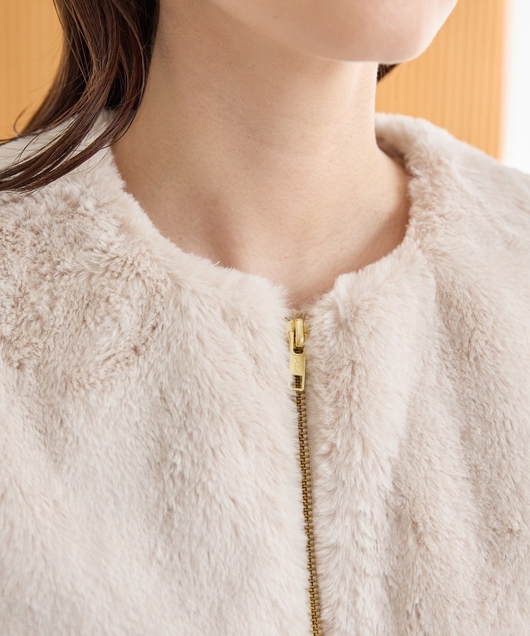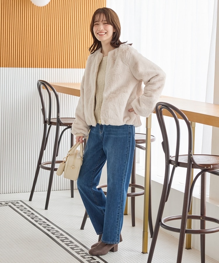 ボリュームが出がちなファーブルゾンをノーカラーでスッキリ仕上げた、上品見えするデザイン。