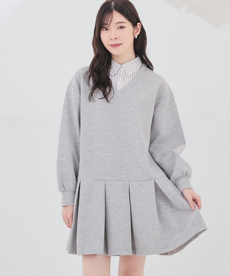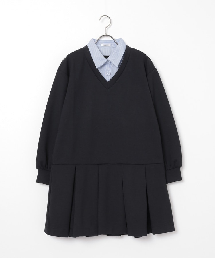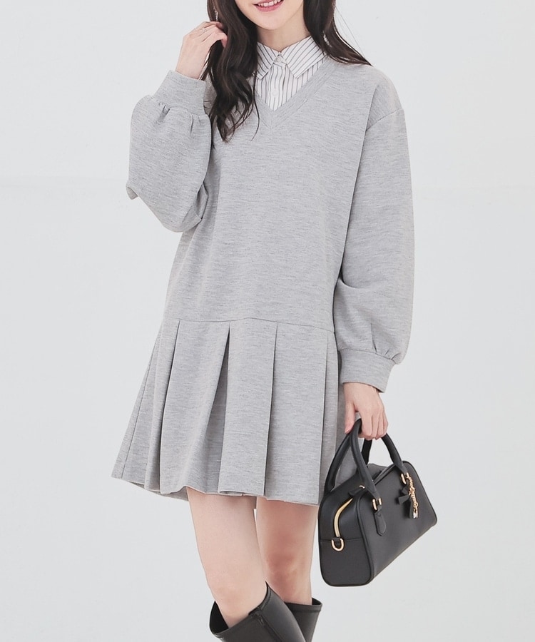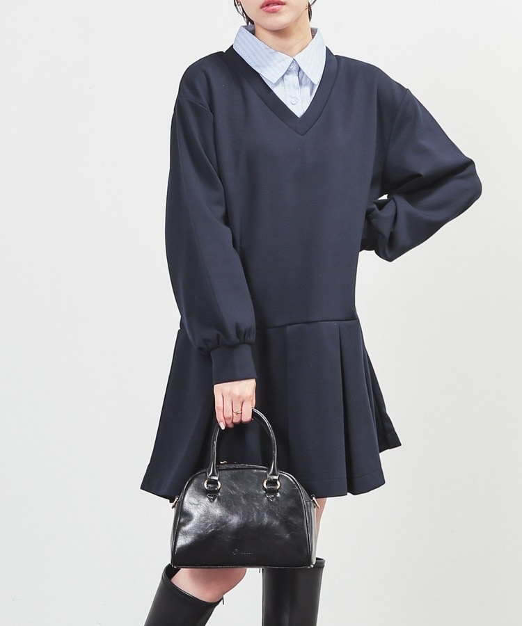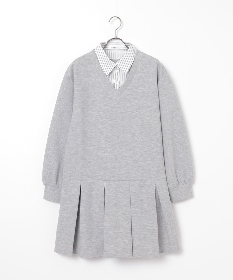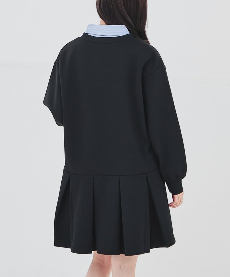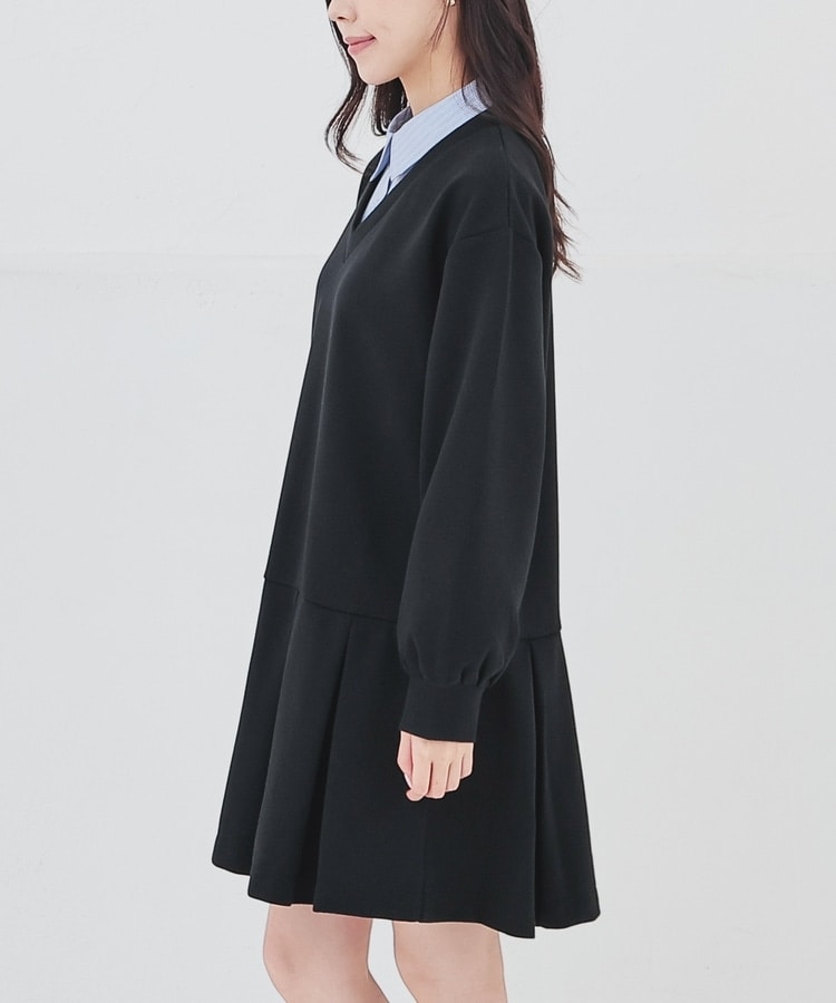 きちんと感のあるレギュラーカラーのシャツ衿とプリーツワンピースをドッキングしたレイヤード風デザイン。
