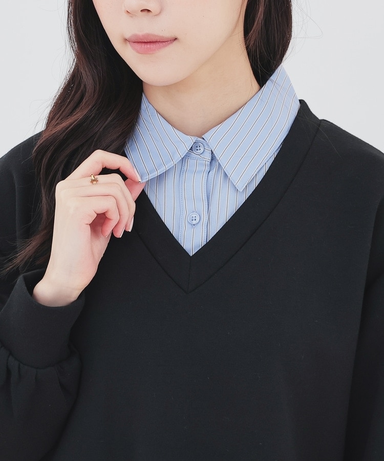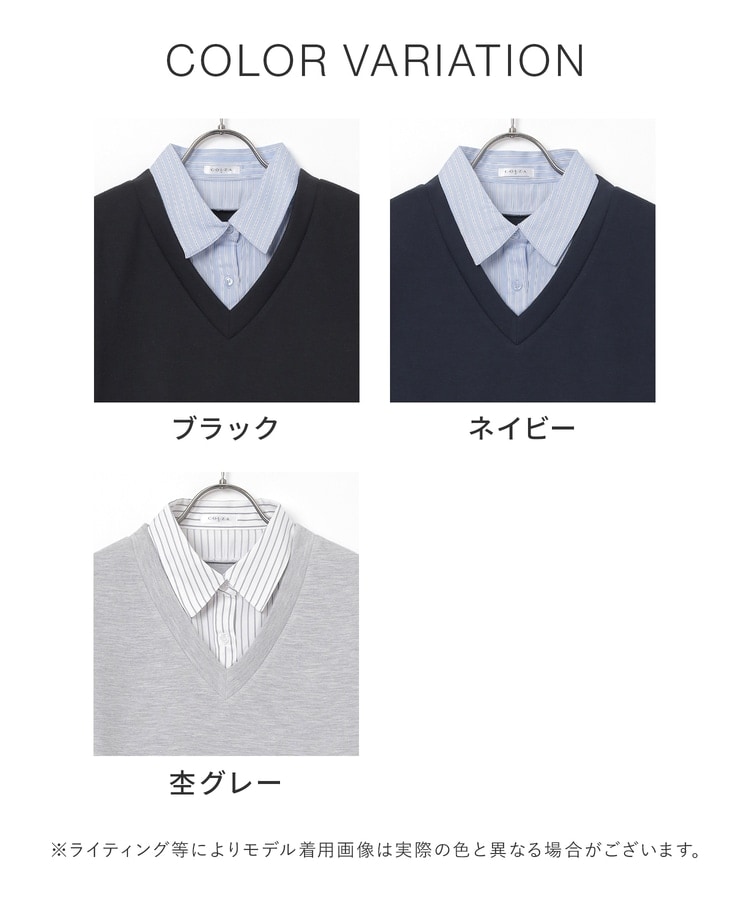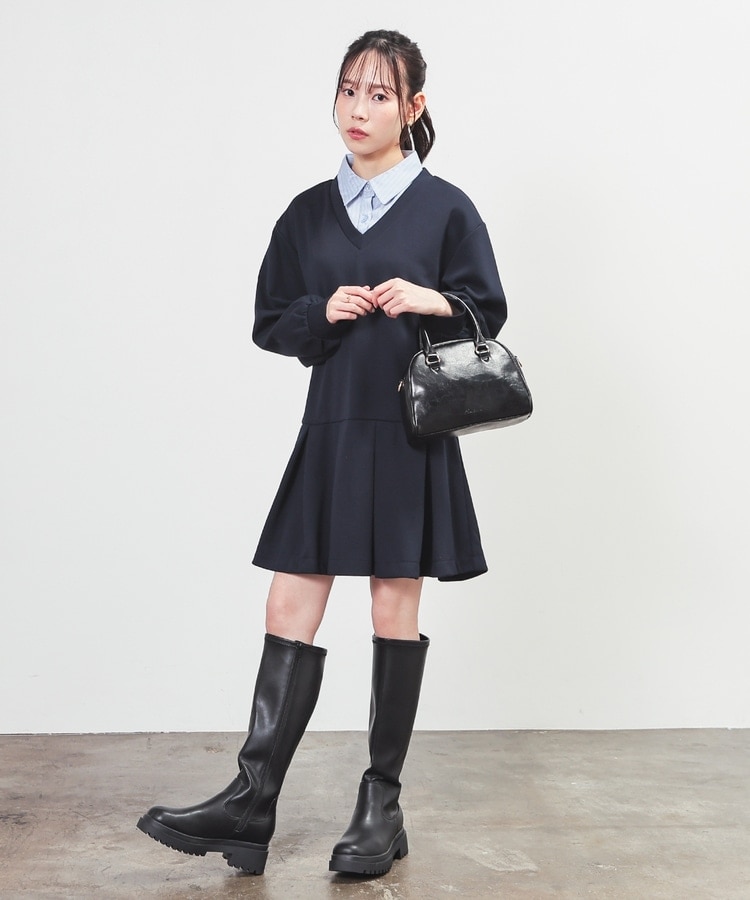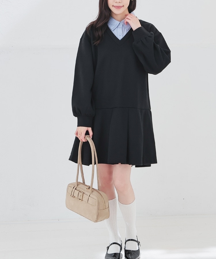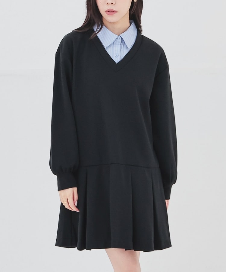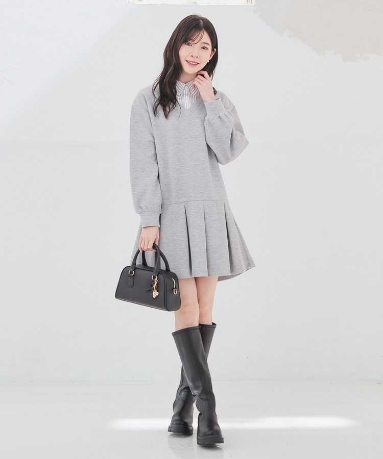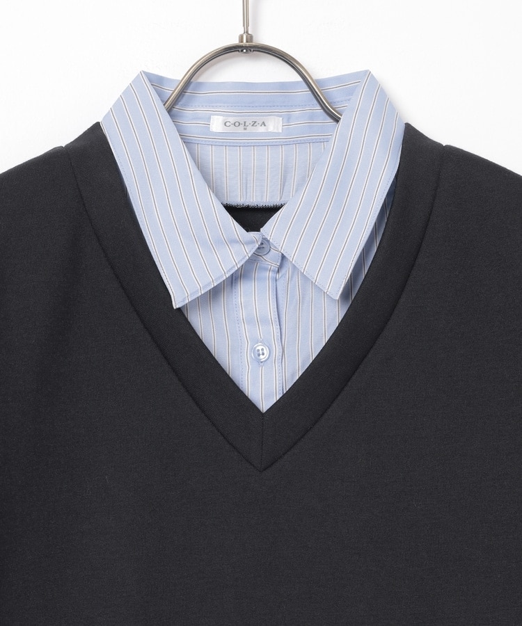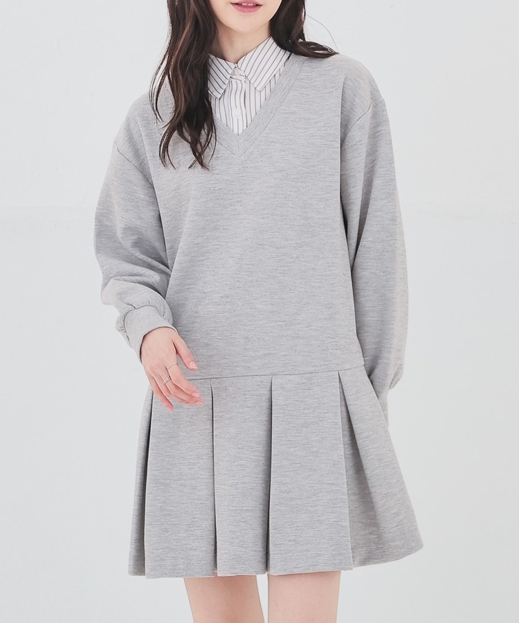 きちんと感のあるレギュラーカラーのシャツ衿とプリーツワンピースをドッキングしたレイヤード風デザイン。