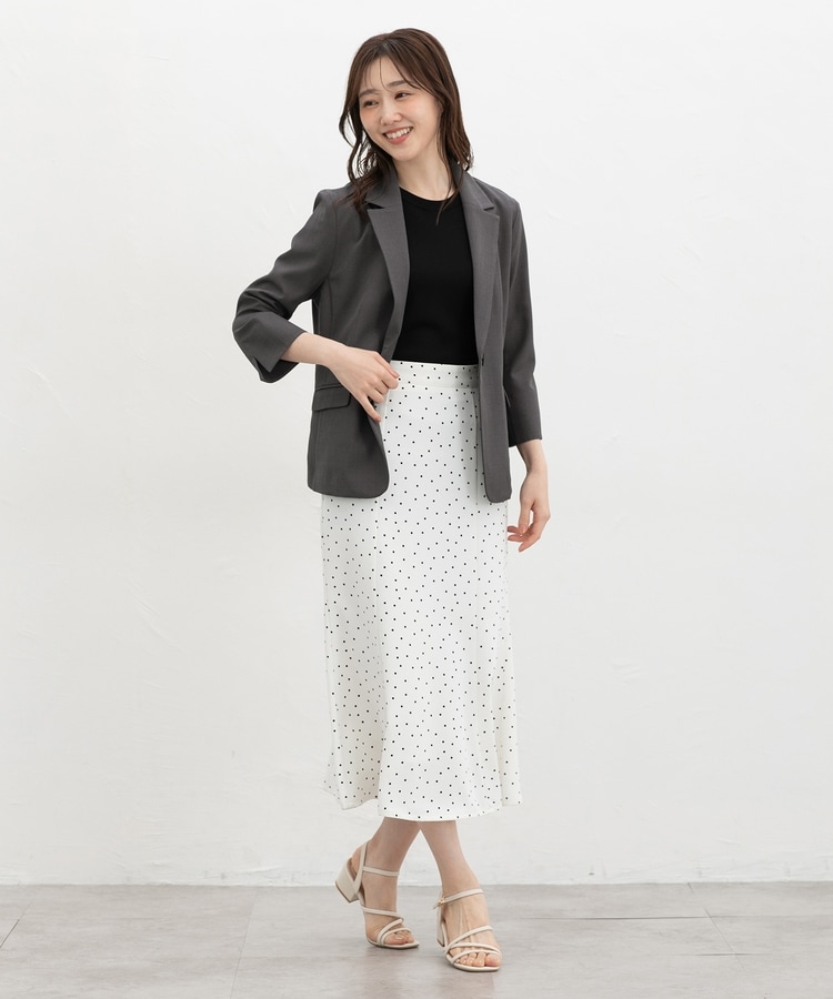 スカートにもパンツにも合う丈感と程よくシェイプされたウエストラインの、すっきり見えシルエット。