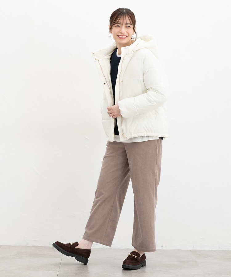 ゆったりした幅とヒップがすっぽり隠れる丈感で、気になる体型もカバー。