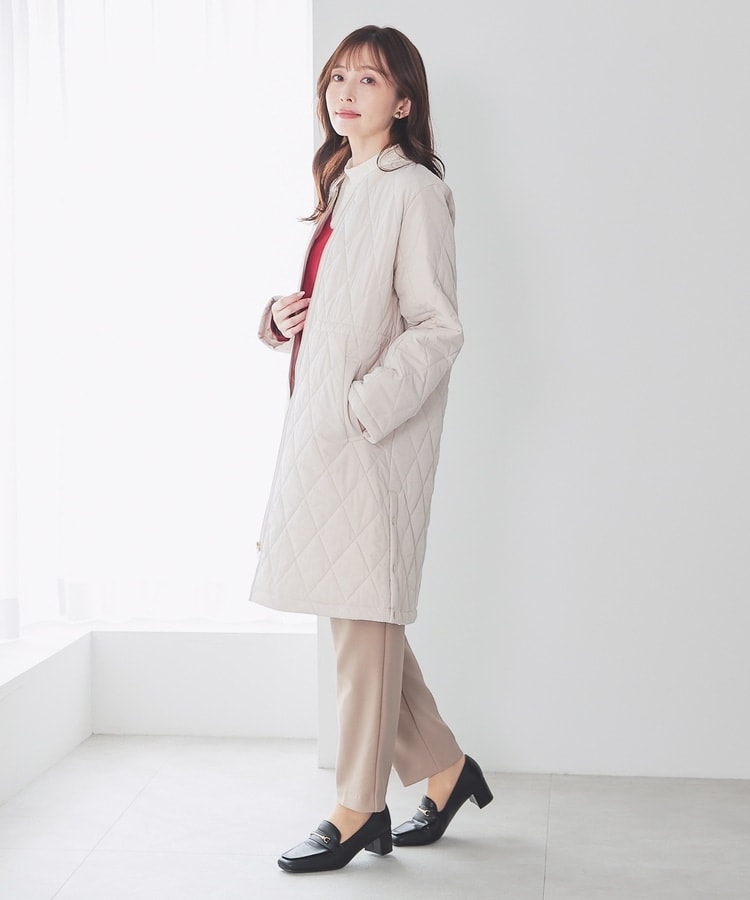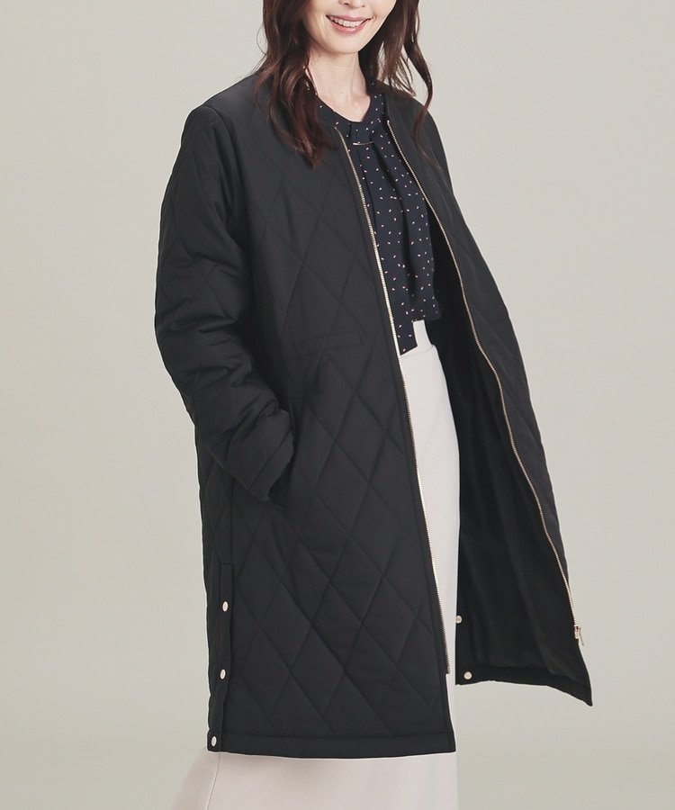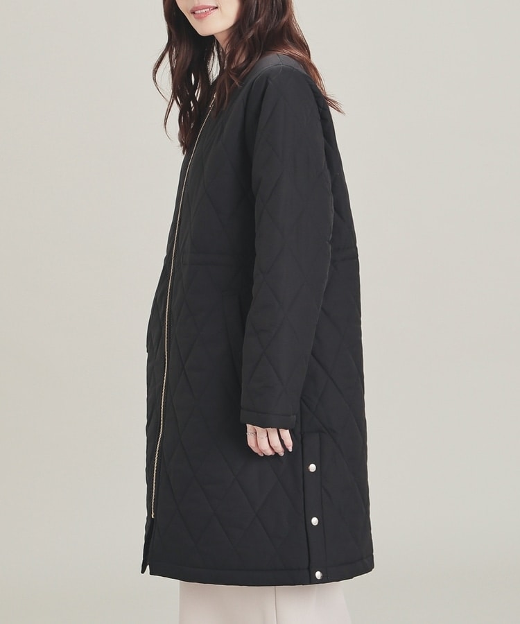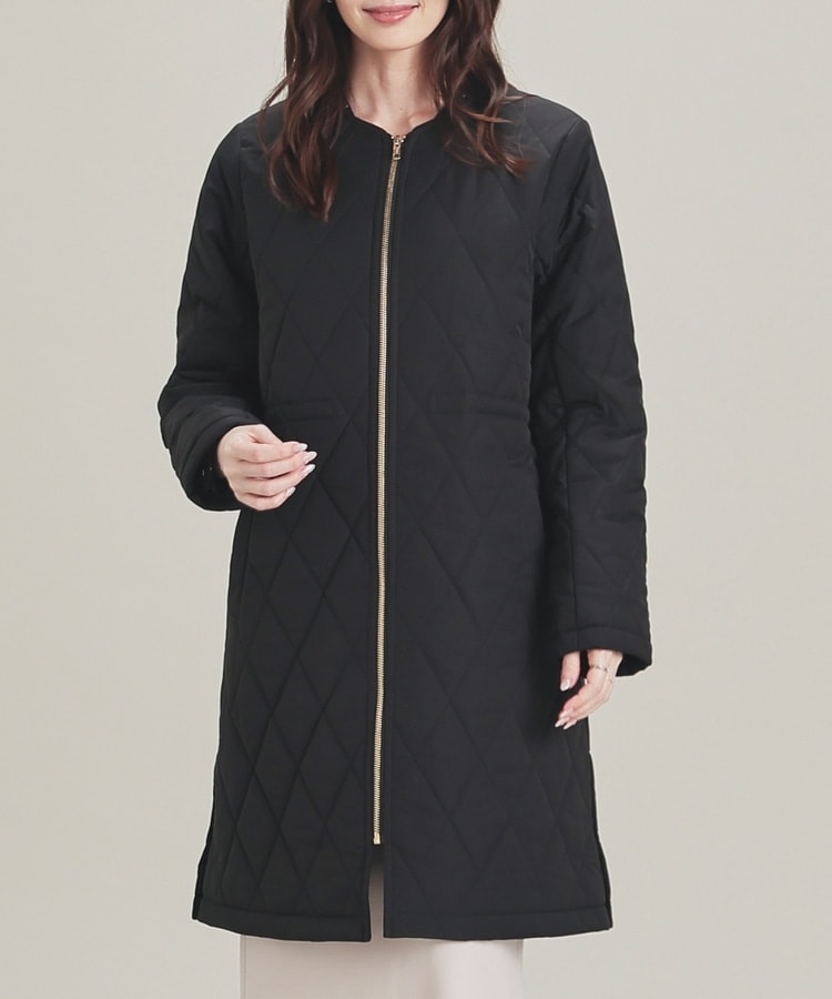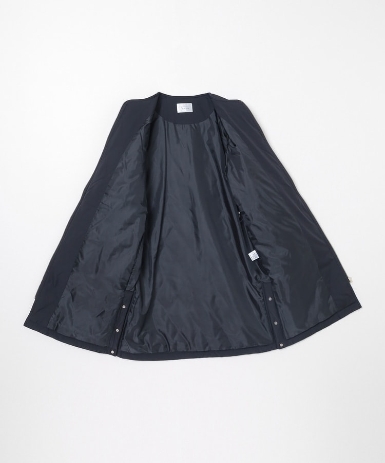 すっきりとしたノーカラーに、裾のゴールドボタンが上品なアクセント。