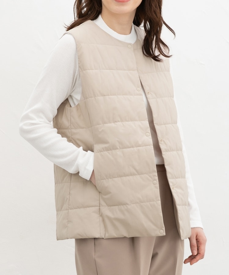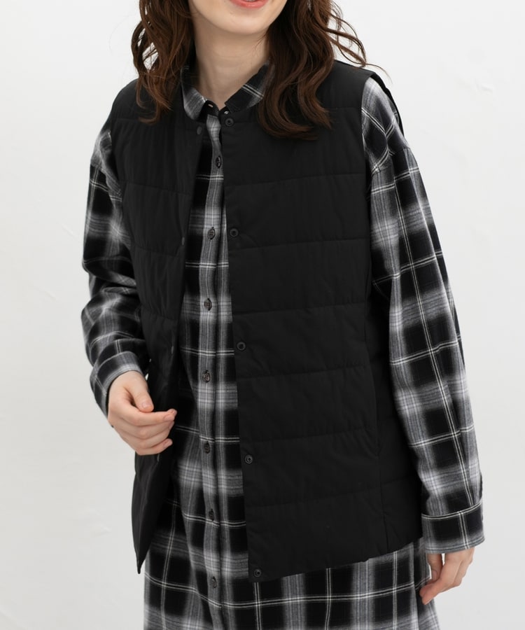 タートルネックのトップスやパーカーなどに羽織るのも、大きめアウターのインナーにするのも◎