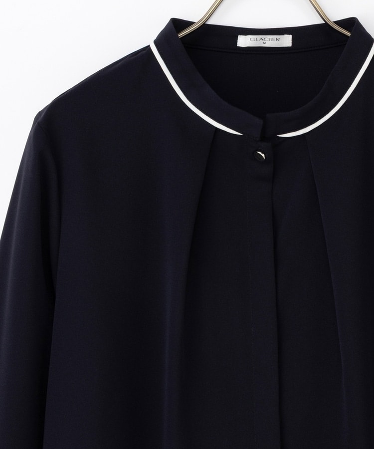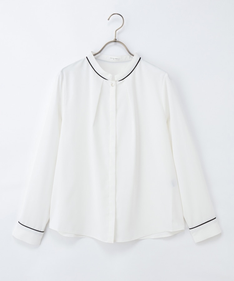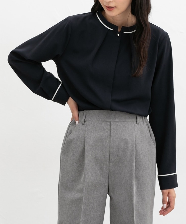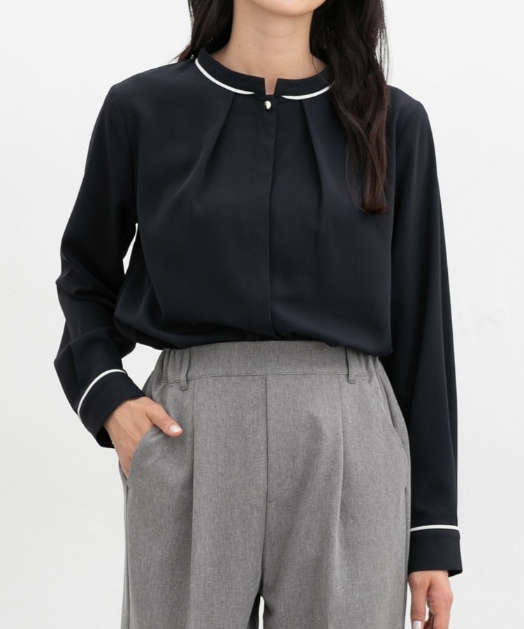 衿ぐり&袖口のさりげない配色パイピングとゴールドボタンがアクセント。
