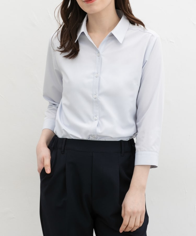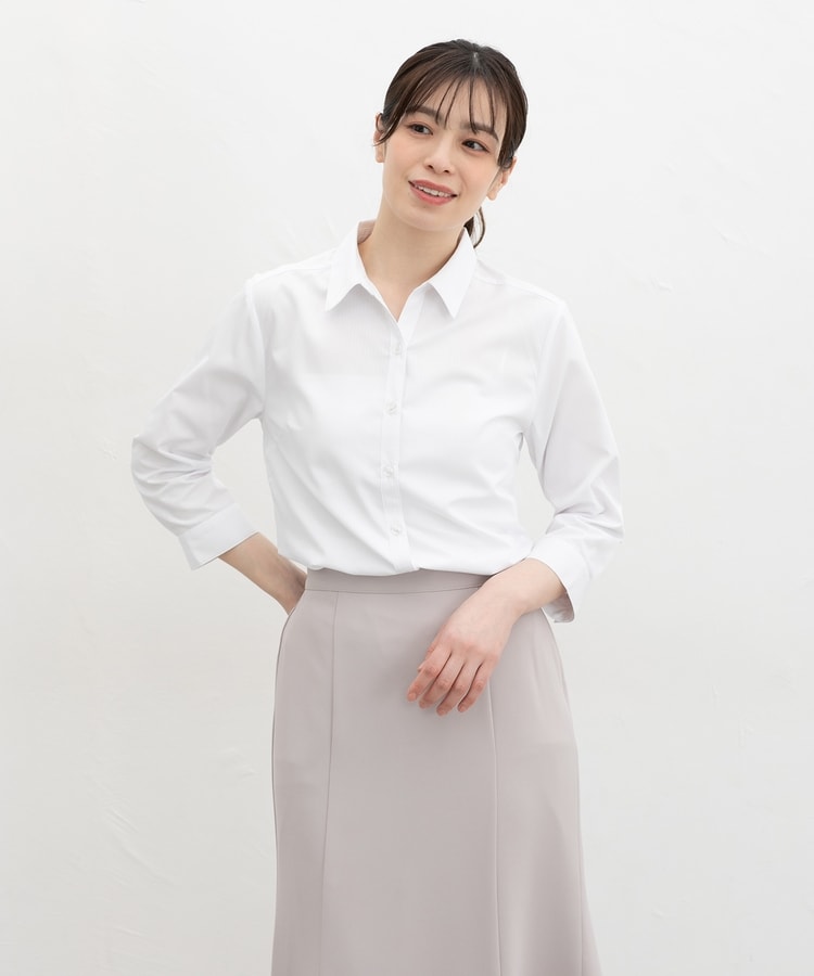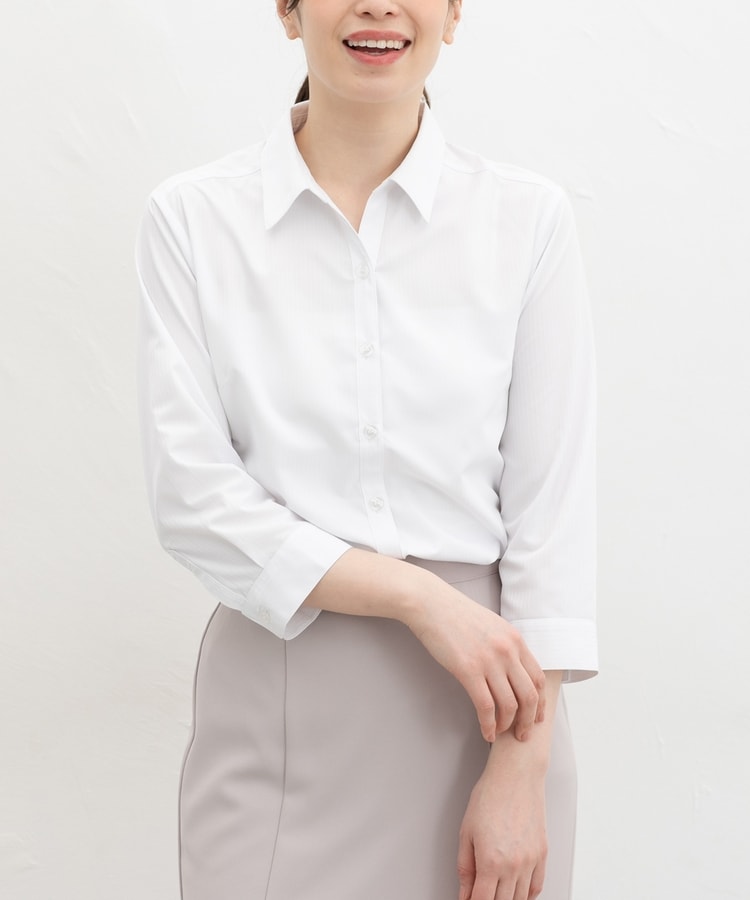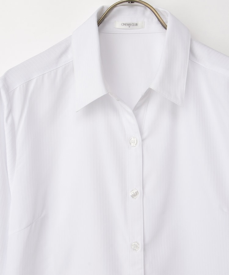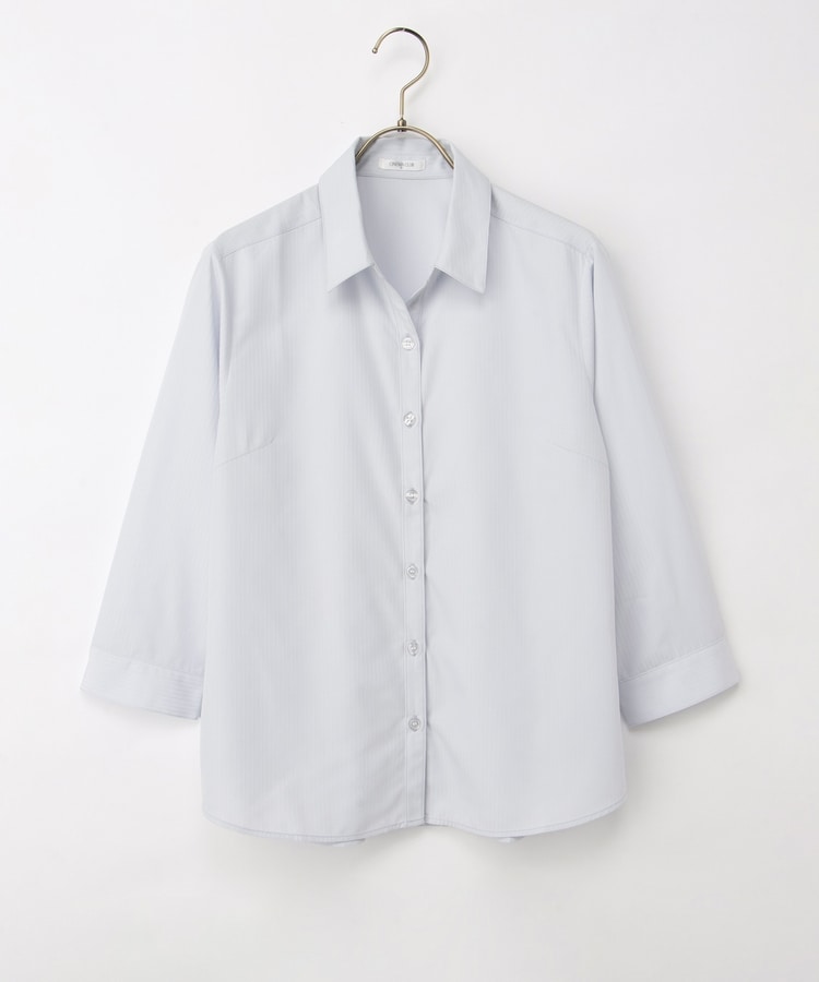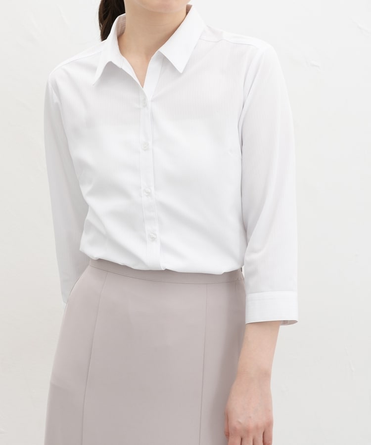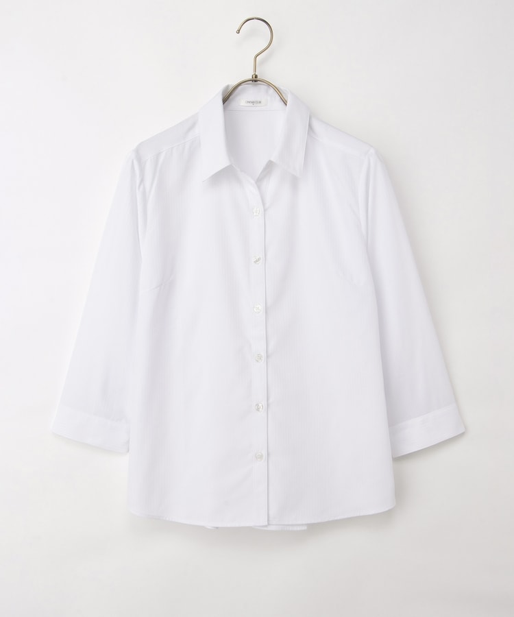 すっきりとしたスキッパー衿で、さりげなく入った織り柄が上品なシンプルデザイン。