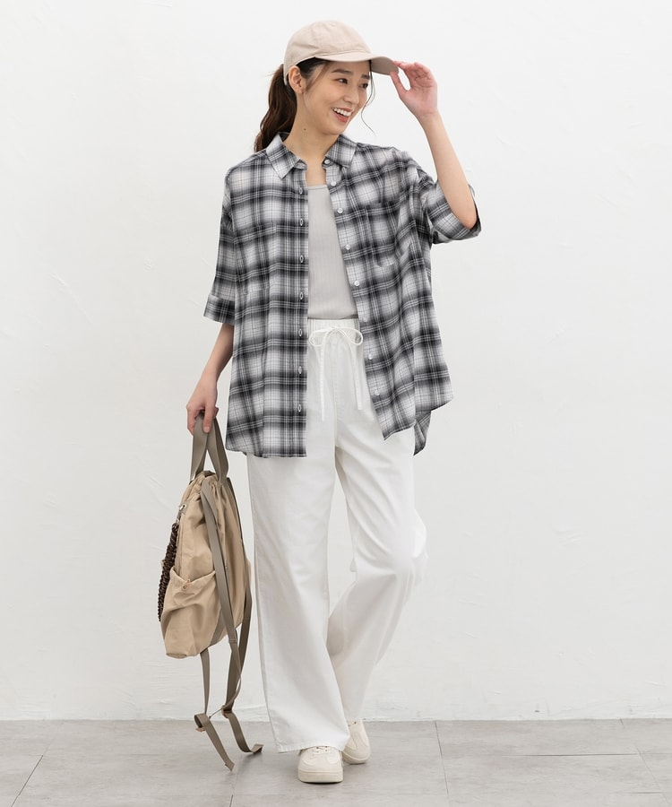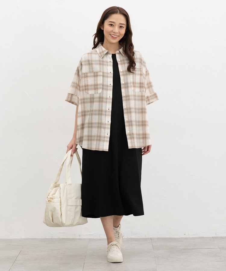 カットソーのロングワンピースやTシャツにボタンを開けて羽織るのも◎